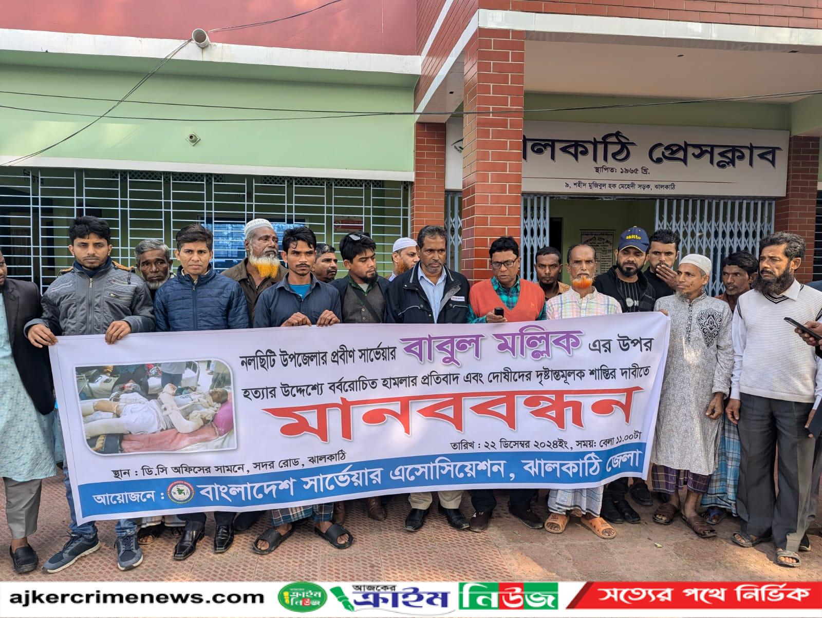 বাংলাদেশ সার্ভেয়ার এসোসিয়েশনের উদ্যোগে নলছিটি উপজেলার প্রবীণ সার্ভেয়ার বাবুল মল্লিকের ওপর হত্যার উদ্দেশ্যে হামলার প্রতিবাদ এবং দোষীদের দৃষ্টান্তমূলক শাস্তির দাবীতে