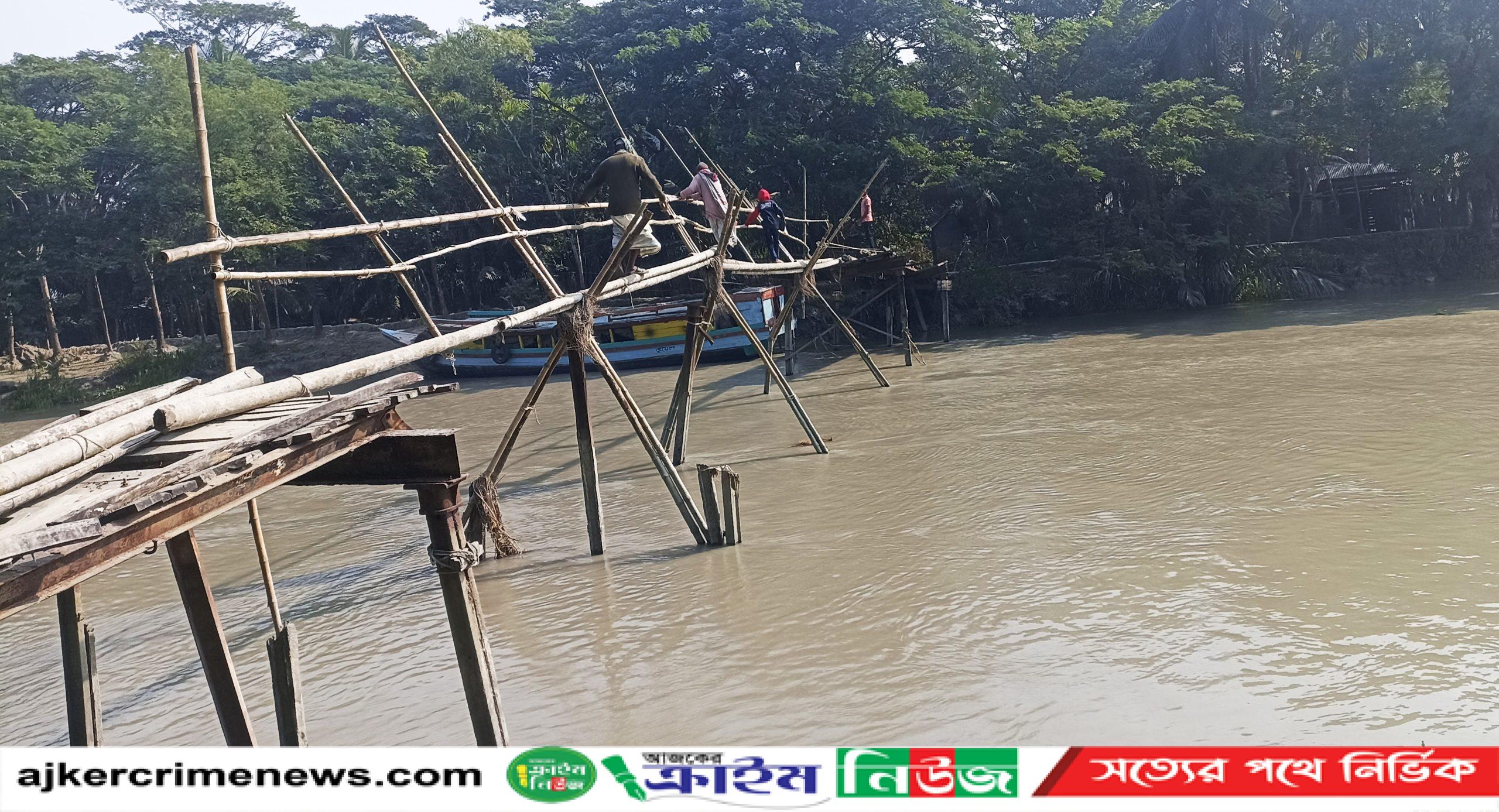এস.এম. সাইফুল ইসলাম কবির, বাগেরহাট: বাগেরহাটের মোরেলগঞ্জে দুটি ইউনিয়নের ৮গ্রামের ২৫হাজার মানুষের যোগাযোগের একমাত্র ভরষা এখন বাঁশের সাকো। খালে ভেঙে পড়া কাঠের পুলের স্থানে দুই বছরেও নির্মান হয়নি পুল বা ব্রীজ। স্কুল শিক্ষার্থী, বয়োবৃদ্ধ, নারী শিশুসহ অসুস্থ রোগীদের ভোগান্তি এখন চরমে। স্থানীয়দের দাবী জনগুরুত্বপূর্ণ চলাচলের স্থানটিতে একটি ব্রীজ নির্মানের।