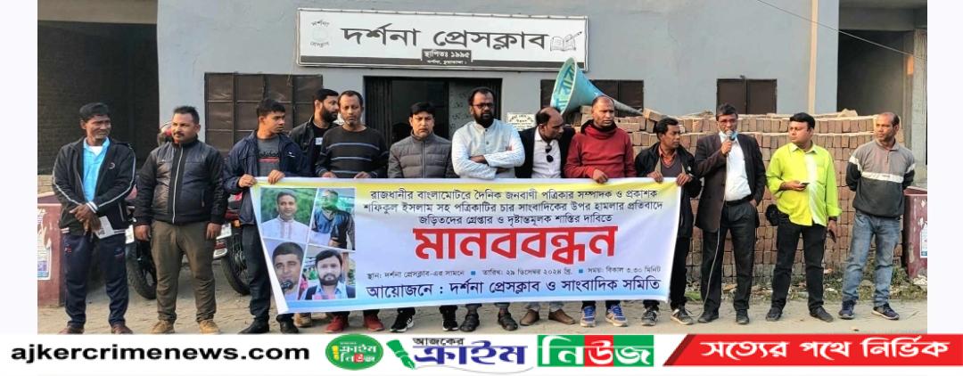 মানববন্ধনে হামলাকারীদের গ্রেপ্তার ও দৃষ্টান্তমূলক শাস্তির দাবি জানানো হয়। মানববন্ধনে দর্শনা প্রেসক্লাবের সাধারণ সম্পাদক মো: ওসমানের সভাপতিত্বে দর্শনা প্রেসক্লাব সাংবাদিক সমিতির সাধারণ সম্পাদক হানিফ মন্ডলের সঞ্চালনায়, বক্তব্য রাখেন, দর্শনা প্রেসক্লাবের সহসভাপতি মাহমুদ হাসান রনি, সাবেক সভাপতি আব্দুল আওয়াল, সহসম্পাদক মনিরুজ্জামান সুমন, সাবেক সম্পাদক চঞ্চল মেহমুদ, নজরুল ইসলাম, জনবাণীর দামুড়হুদা প্রতিনিধি ও সাবেক সাধারণ সম্পাদক আহসান হাবিব মামুন, হাসমত আলী, রাজিব মল্লিক, ইমতিয়াজ রয়েল, ওয়াসিম রয়েল, ফরহাদ হোসেন, আব্দুল আলিম, আবিদ হাসান রিফাত, আব্দুল হান্নান।এছাড়া সাংবাদিক বিল্লাল হোসেন, আসিম সাইফ, জালাল উদ্দিন।