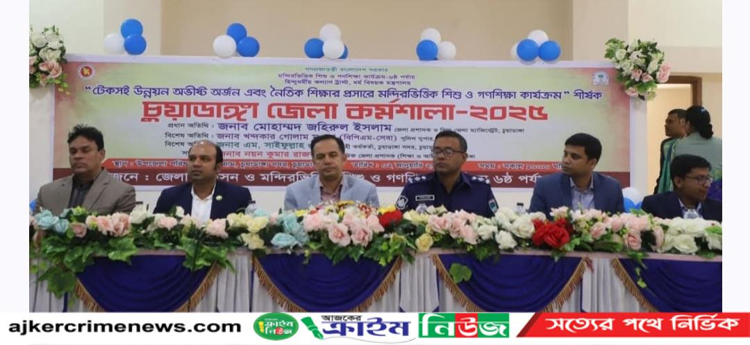 বৃহস্পতিবার সকাল ১০ টায় চুয়াডাঙ্গা জেলা প্রশাসন ও মন্দিরভিত্তিক শিশু ও গণশিক্ষা কার্যক্রম-৬ষ্ঠ পর্যায়, চুয়াডাঙ্গার আয়োজনে উপজেলা পরিষদ অডিটরিয়ামে "টেকসই উন্নয়ন অভীষ্ট অর্জন এবং নৈতিক শিক্ষার প্রসারে মন্দির ভিত্তিক শিশু ও গণশিক্ষা কার্যক্রম" প্রতিপাদ্যে চুয়াডাঙ্গা জেলা কর্মশালার সভাপতিত্ব করেন অতিরিক্ত জেলা প্রশাসক (শিক্ষা ও আইসিটি) নয়ন কুমার রাজবংশী।প্রধান অতিথি হিসেবে উপস্থিত ছিলেন