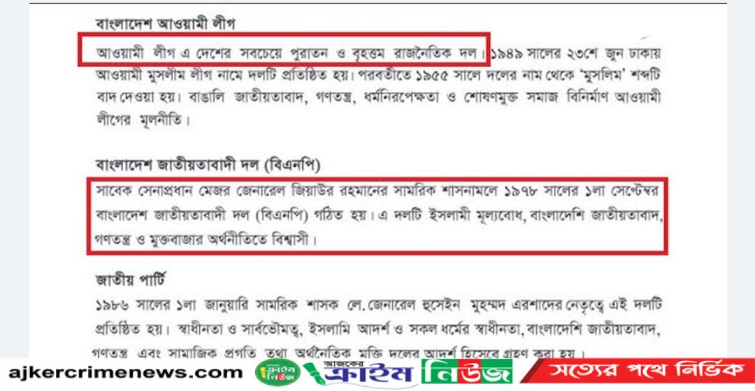 নতুন শিক্ষাবর্ষে শিক্ষার্থীদের হাতে যাওয়া ৯ম-১০ম শ্রেণীর ‘পৌরনীতি ও নাগরিকতা’ বই বিশ্লেষণ করে দেখা যায়, বইটির ৭৩ নং পৃষ্ঠায় ‘গণতন্ত্রে রাজনৈতিক দল ও নির্বাচন ব্যবস্থা’ শীর্ষক সপ্তম অধ্যায়ে বাংলাদেশের প্রধান রাজনৈতিক দলসমূহ অধ্যায়ে ‘বাংলাদেশ আওয়ামী লীগ’ সাব টপিকে বলা আছে, ‘আওয়ামী লীগ এ দেশের সবচেয়ে পুরাতন ও বৃহত্তম রাজনৈতিক দল। ১৯৪৯ সালের ২৩শে জুন ঢাকায় আওয়ামী মুসলিম লীগ নামে দলটি প্রতিষ্ঠিত হয়। পরবর্তীতে ১৯৫৫ সালে দলের নাম থেকে 'মুসলিম' শব্দটি বাদ দেওয়া হয়। বাঙ্গালি জাতীয়তাবাদ, গণতন্ত্র, ধর্মনিরপেক্ষতা ও শোষণমুক্ত সমাজ বিনির্মাণ আওয়ামী লীগের মূলনীতি।’