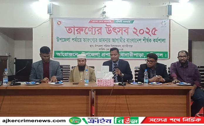 মো:নাঈম মোঘল বানারীপাড়া প্রতিনিধি:তারুণ্যের ভাবনায় আগামীর বাংলাদেশ শীর্ষক কর্মশালায় "এসো দেশ বদলাই,পৃথিবী বদলাই” এই প্রতিপাদ্যকে সামনে রেখে তারুণ্যের উৎসব ২০২৫ উদযাপন হয়েছে। মঙ্গলবার বেলা ৩ টায় বানারীপাড়া উপজেলা নির্বাহী কর্মকর্তা বায়েজিদুর রহমানের সভাপতিত্বে উপজেলা মিলনায়তনে কর্মশালায় বক্তৃতা করেন উপজেলা নির্বাহী কর্মকর্তা ও পৌর প্রশাসক বায়েজিদুর রহমান, বানারীপাড়া থানা ইনচার্জ মোহাম্মদ মোস্তফা, বানারীপাড়া উপজেলা স্বাস্থ্য কমপ্লেক্স এর মেডিকেল অফিসার ড.রোমান, উপজেলা এল.জি.ই.ডি প্রকৌশলী মো: আশিকুর রহমান,উপজেলা কৃষি কর্মকর্তা মোঃ মাহফুজুর রহমান, উপজেলা প্রাথমিক শিক্ষা কর্মকর্তা মো: রফিকুল ইসলাম সরদার, উপজেলা যুব উন্নয়ন কর্মকর্তা মো: রফিকুল ইসলাম তালুকদার, উপজেলা সমাজসেবা কর্মকর্তা পার্থ সারথি দেউরী সহ বিভিন্ন দপ্তরের সরকারি কর্মকর্তা ও বিভিন্ন স্কুলের শিক্ষার্থীর এসময় উপস্থিত বিভিন্ন ইউনিয়ন ও পৌর শহরের শিক্ষার্থীদের মধ্যে থেকে বিভিন্ন দলে বিভক্ত হয়ে তারুণ্যের ভাবনায় আগামীর বাংলাদেশ ” শীর্ষক প্রতিযোগি