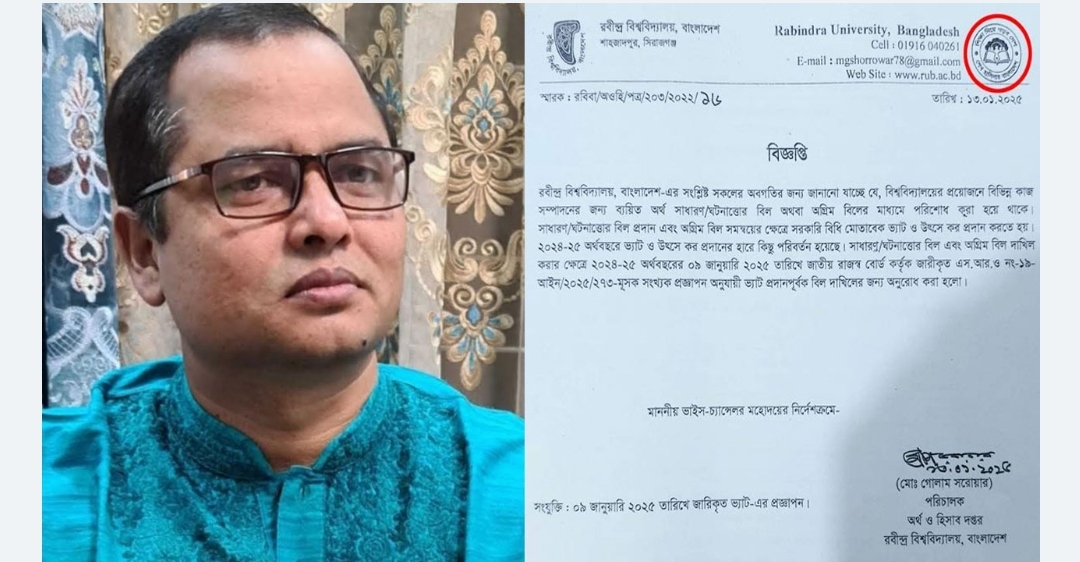 রবীন্দ্র বিশ্ববিদ্যালয়ের উপ-উপাচার্য ও রেজিস্ট্রার (চলতি দায়িত্ব) অধ্যাপক ড. সুমন কান্তি বড়ুয়া স্বাক্ষরিত ওই আদেশে বলা হয়, সরকারি ভ্যাট ও উৎসে কর পরিশোধ সংক্রান্ত সরকারি প্রজ্ঞাপনের পক্ষে প্রকাশিত বিজ্ঞপ্তিতে গণ-অভ্যুত্থানে ক্ষমতাচ্যুত সরকারের স্লোগান সম্বলিত নিষিদ্ধ প্যাড ব্যবহারের অভিযোগ ও প্রাথমিক তথ্যাদি প্রমাণিত হয়েছে। যা রবীন্দ্র বিশ্ববিদ্যালয়, বাংলাদেশের শিক্ষক, কর্মকর্তা ও কর্মচারী আচরণ বিধিমালা ৪ ধারা লঙ্ঘিত হয়েছে। যে কারণে প্রতিষ্ঠানের ১১ (৭) আইনের ধারা অনুযায়ী অর্থ ও হিসাব দপ্তরের পরিচালক গোলাম সরোয়ারকে সাময়িক বরখাস্ত করা হলো। এ সময় তিনি বিধি মোতাবেক খোরপোশ ভাতা প্রাপ্য হবেন। গতকাল (১৫ জানুয়ারি) অপরাহ্ন থেকেই এ আদেশ কার্যকর হবে বলেও ওই আদেশে উল্লেখ করা হয়েছে।