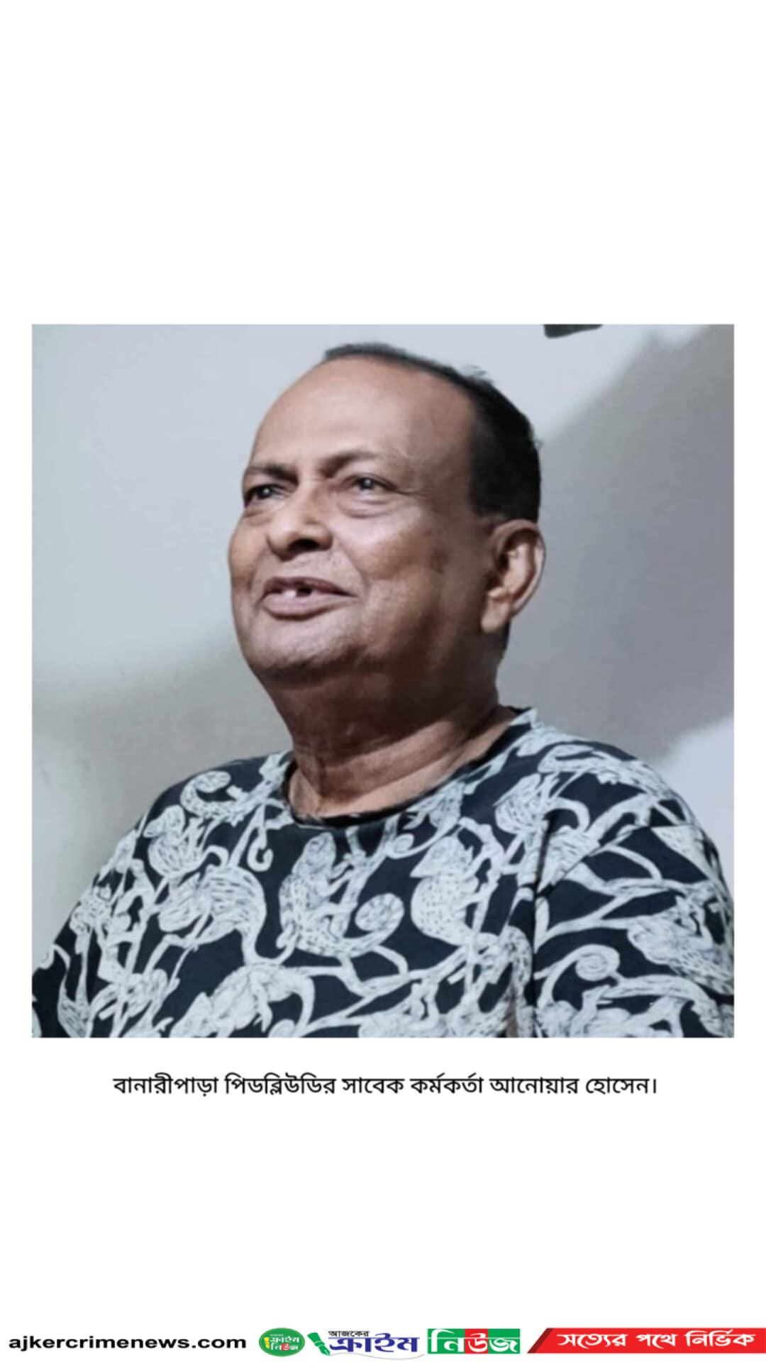 পিডব্লিউডি'র অবসরপ্রাপ্ত কর্মকর্তা মোঃ আনোয়ার হোসেন (৭০) শনিবার (১৮ জানুয়ারী) দুপুর দেড়টার দিকে বরিশাল শেবাচিম হাসপাতালে ডায়াবেটিস ও শ্বাসকষ্ট জনিত রোগে চিকিৎসাধিন অবস্থায় ইন্তেকাল করেন (ইন্না......রাজিউন)। মৃত্যুকালে তিনি এক ছেলে ও এক মেয়েসহ বহু গুনগ্রাহী রেখে গেছেন। মরহুম আনোয়ার হোসেন