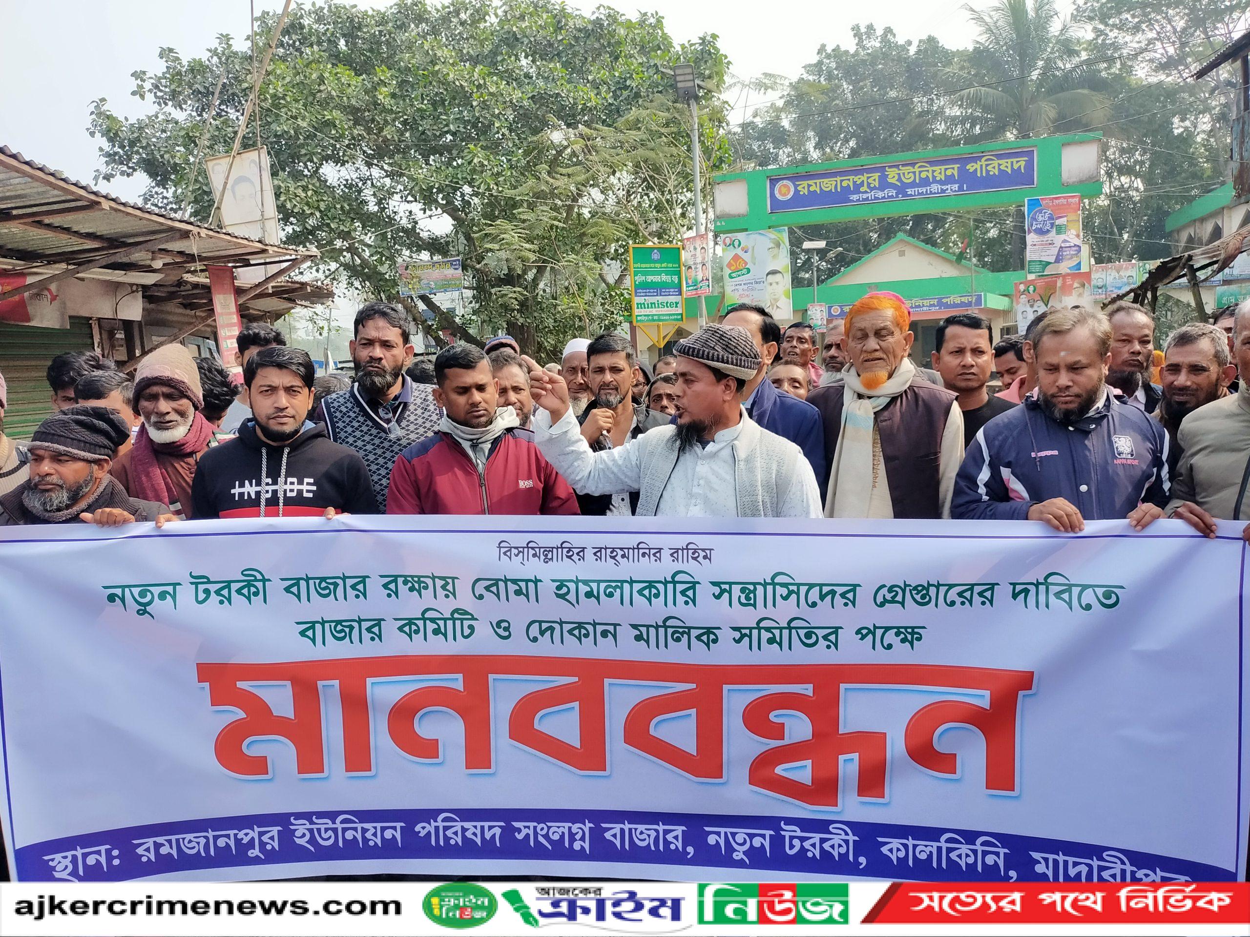 মাদারীপুরের কালকিনি রমজানপুরে বোমাবাজ সন্ত্রাসীদের গ্রেপ্তারের দাবিতে মানববন্ধন কর্মসূচি পালন করেন। মঙ্গলবার সকালে উপজেলার রমজানপুর ইউনিয়ন পরিষদের সামনে নতুন টরকী বাজারের দোকান মালিক সমিতির পক্ষ থেকে ঘন্টা ব্যাপী এ মানববন্ধন অনুষ্ঠিত হয়।