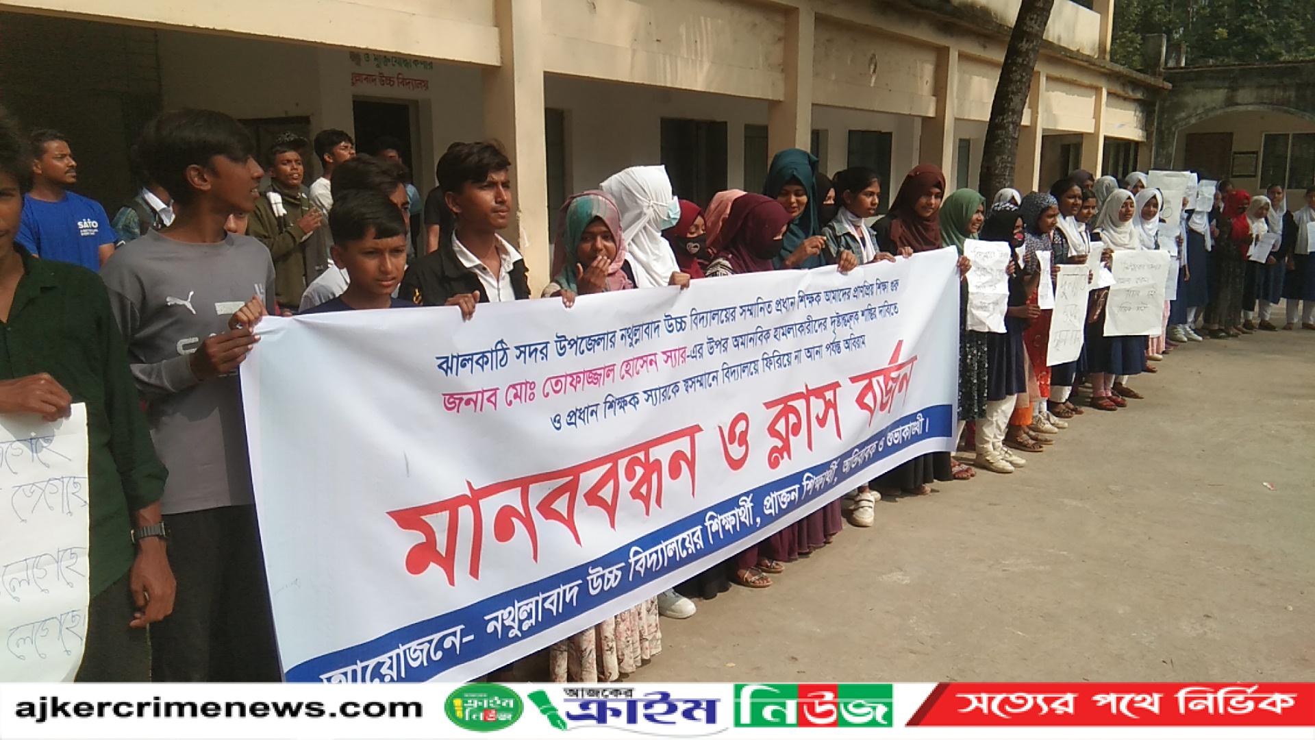 ঝালকাঠি প্রতিনিধি :ঝালকাঠি সদরের নতুল্লাবাদ মাধ্যমিক বিদ্যালয়ের প্রধান শিক্ষক তোফাজ্জল হোসেন এর উপর হামলাকারীদের দৃষ্টান্তমূলক শাস্তির দাবিতে বুধবার সকালে স্কুলের সামনে শিক্ষার্থী মানববন্ধন ও বিক্ষোভ করছে। এ সময় শিক্ষার্থীরা বলেন আমাদের প্রাণপ্রিয় শিক্ষা গুরু জনাব মোঃ তোফাজ্জাল হোসেন স্যার-এর উপর অমানবিক হামলাকারীদের দৃষ্টান্তমূলক শাস্তি ও প্রধান শিক্ষক স্যারকে স্বসম্মানে বিদ্যালয়ে ফিরিয়ে না আনা পর্যন্ত অবিরাম মানববন্ধন ও ক্লাস বর্জন চলবে।
