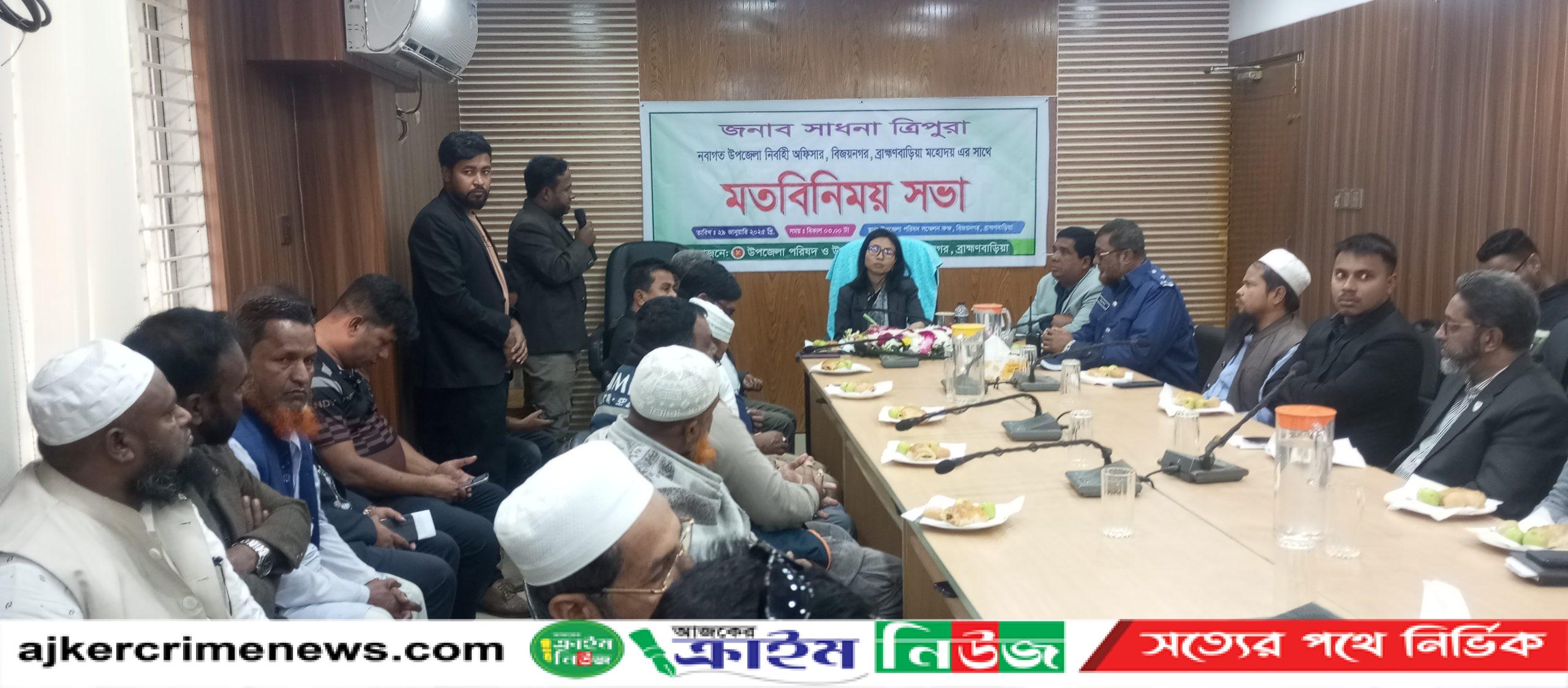 বিজয়নগরে নবাগত ইউএনও সাধনা ত্রিপুরা উপজেলার বিভিন্ন দপ্তরের প্রধান, জনপ্রতিনিধি, সাংবাদিক, মুক্তিযোদ্ধা, ব্যবসায়ী প্রতিনিধি, শিক্ষক, ছাত্র প্রতিনিধি, সুশীল সমাজের প্রতিনিধিদের সঙ্গে মতবিনিময় করেন।