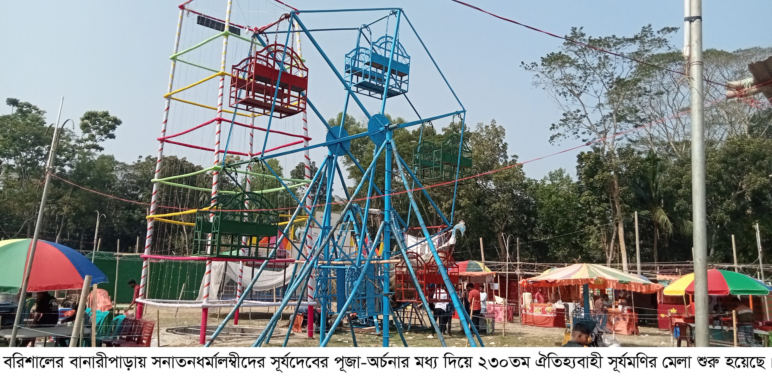 রাহাদ সুমন,বিশেষ প্রতিনিধি॥ বরিশালের বানারীপাড়ায় মাসব্যাপি ২৩০তম ঐতিহ্যবাহী সূর্যমণি মেলা শুরু হয়েছে। মঙ্গলবার (৪ ফেব্রুয়ারী) বেলা ১১টায় উপজেলার সলিয়াবাকপুর ইউনিয়নের বেতাল গ্রামে প্রয়াত খবির উদ্দিন মোল্লার বিশাল মাঠে সূর্যদেবের পুজার মধ্য দিয়ে আনুষ্ঠানিকভাবে এ মেলার শুরু হয়। মেলা প্রাঙ্গনে মন্দিরে সূর্যদেবের পূজা অর্চনার নেতৃত্ব দেন পুজারী কৃষ্ণকান্ত ভট্টাচার্য। আবহমান গ্রাম বাংলার ইতিহাস-ঐতিহ্য ধরে রাখতে সূর্যপুজা উপলক্ষে সনাতন ধর্মাবলম্বীরা প্রতি বছর মাঘ মাসের মাঘী পূর্ণিমার শুক্লা তিথিতে সূর্যপুজার মধ্য দিয়ে মাস ব্যাপী এ সূর্যমণি মেলার আয়োজন করে থাকেন। কথিত আছে সূর্য দেবের পুজা উপলক্ষে নিজস্ব ভূমিতে বেতাল গ্রামের গঙ্গু সরকারের পূর্ব পুরুষরা এ মেলার আয়োজন করতেন। একদিন থেকে সপ্তাহ,সপ্তাহ থেকে পাক্ষিক পরবর্তীতে কালের বিবর্তনে মাস ব্যপী সূর্যমণির মেলার আয়োজন হয়ে আসছে। মেলার ইতিহাস জানতে গিয়ে জানা যায়,সরকার পরিবার মেলার স্থানের জমিতে ধান চাষের জন্য চাষ করাচ্ছিলেন। চাষিরা লাঙ্গল চালানোর সময় বর্তমানে মেলার মাঠের যে স্থানে মন্দির রয়েছে সেখানে ফলা আটকে যায়। কিছুতেই চাষিরা লাঙ্গলের সেই ফলা সামনে অগ্রসর করতে পারছিলেন না। এমন খবর সরকার বাড়িতে গিয়ে জানান চাষিরা। এ খবরে গঙ্গু সরকারের মা দেবী মালা সরকার তাদের পাইক-প্যাদা নিয়ে ওই স্থানে উপস্থিত হন। যেখানে ফলা আটকে গিয়েছিলে সেখানটা ৪/৫ জন চাষি মিলে পুনরায় খুঁড়তে থাকেন। ওই সময় ফলার মাঝ বরাবরে একটি সূর্যাকৃতির মূল্যমান কষ্টি পাথরের মূর্তি পাওয়া যায়। দিনটি ছিলো মাঘী পূর্ণিমার শুক্লা তিথি। ওই সময় একটি কাঠের ঘর তুলে মূর্তিটি সেখানে রক্ষিত রাখা হয় এবং সূর্যদেবের পূজার মধ্য দিয়ে একদিনের মেলার আয়োজন করেন সরকার পরিবার। সেই থেকেই প্রতি বছর মাঘী পূর্ণিমার শুক্লা তিথিতে মেলার আয়োজন হয়ে আসছে। এভাবে আয়োজনের এক পর্যায়ে গঙ্গু সরকার পরিবার বেতাল গ্রামের তাদের পৈত্রিক বাড়িসহ যাতীয় স্থাবর-অস্থাবর সম্পত্তি প্রতিবেশী মোল্লা পরিবারের কাছে বিক্রি করে ভারতে চলে যান। তবে সরকার পরিবারের কয়েকটি শর্ত ছিলো জমি লিখে দেয়ার সময়। যার মধ্যে উল্লেখযোগ্য ছিলো প্রতি বছর যে স্থানে মেলা আয়োজন হয় সেখানে সূর্যদেবের পাকা মন্দির তৈরি করতে দেয়া, মেলা আয়োজনে সহযোগীতা করা, সনাতন ধর্মাবলম্বীদের সমন্বয়ে কমিটি গঠন, সরকার বাড়ির প্রতিবেশি ভট্টাচার্য পরিবারের সদস্যদের দিয়ে সূর্যদেবের পূজা-অর্চনা করানো,অত্রঅঞ্চলের সনাতন ধর্মাবলম্বীদের পাশে থাকা প্রভৃতি। পরবর্তীতে মোল্লা পরিবারের সহযোগীতায় সনাতন ধর্মাবলম্বীরা পর্যায়ক্রমে মেলার আয়োজন করে আসছেন। এ বছর মেল