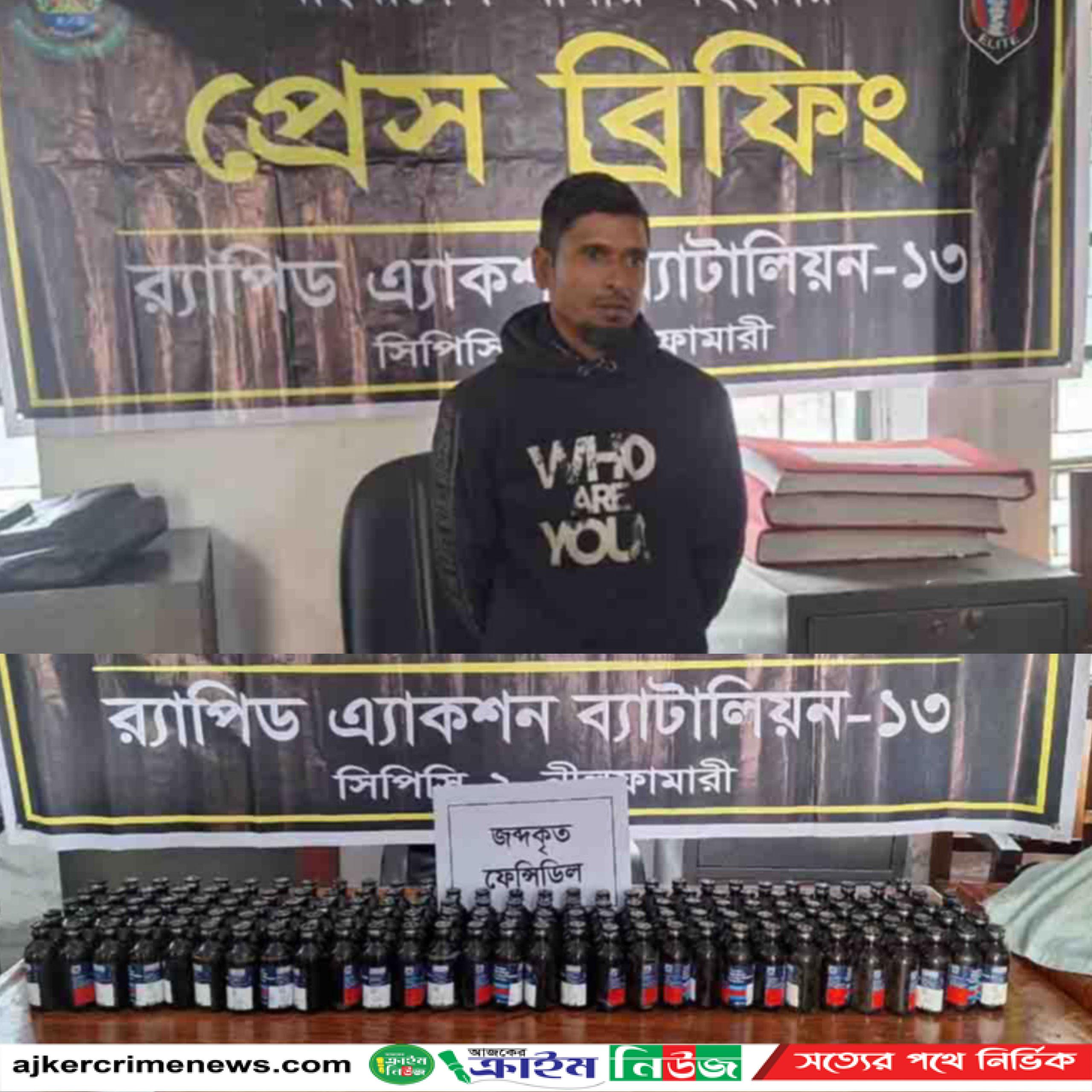ক্রাইম রিপোর্টার।।নীলফামারীর ডিমলায় ১৪৯ বোতল ভারতীয় ফেন্সিডিলসহ জাহিদুল ইসলাম (৪৭)নামের এক মাদক ব্যবসায়ীকে গ্রেপ্তার করেছে র্যাব-১৩, সিপিসি-২, নীলফামারী ক্যাম্পের একটি চৌকস দল।রোববার (১৬ ফেব্রুয়ারি) সকাল ১১টায় গোপন সংবাদের ভিত্তিতে মাদক বিরোধী অভিযান চালিয়ে ডিমলা উপজেলার খালিশা চাপানী ইউনিয়নের ডালিয়া পানি উন্নয়ন বোর্ডের সামনে ইজিবাইকে থাকা ১৪৯ বোতল ফেন্সিডিলসহ ওই মাদক ব্যবসায়ীকে গ্রেপ্তার করা হয়।গ্রেপ্তারকৃত মাদক ব্যবসায়ী লালমনিরহাট জেলার হাতিবান্ধা উপজেলার পূর্ব ফকিরপাড়া গ্রামের আব্দুল করিমের ছেলে।
