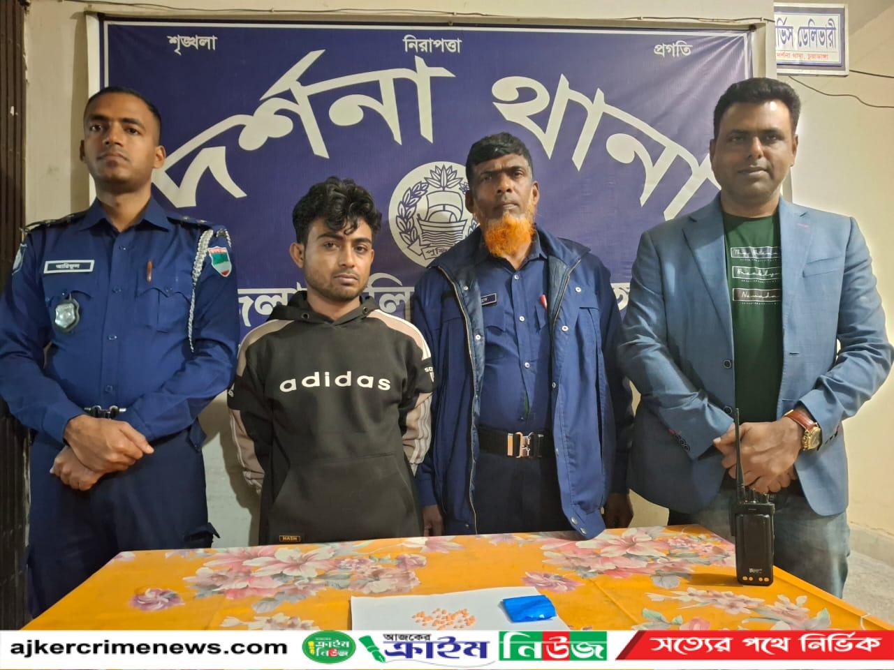 শনিবার মাঝরাতে দর্শনা থানার অফিসার ইনচার্জ মুহম্মদ শহীদ তিতুমীর এর তত্বাবধানে দর্শনা থানার এসআই (নিঃ) মোঃ মাসুদুর রহমান সঙ্গীয় ফোর্সসহ দর্শনা পৌর এলাকার শান্তিপাড়া সুগন্ধা মাঠ এলাকায় গোপন সংবাদের ভিত্তিতে অভিযান চালায়। এমময় শান্তি পাড়ার আকরাম খানের ছেলে মোঃ হাবিবুর হাকিম বিপ্লব (২৮) গ্রেফতার করে তার হেফাজত হতে অবৈধ মাদকদ্রব্য ৫২ পিচ ইয়াবা ট্যাবলেট উদ্ধার হয়।