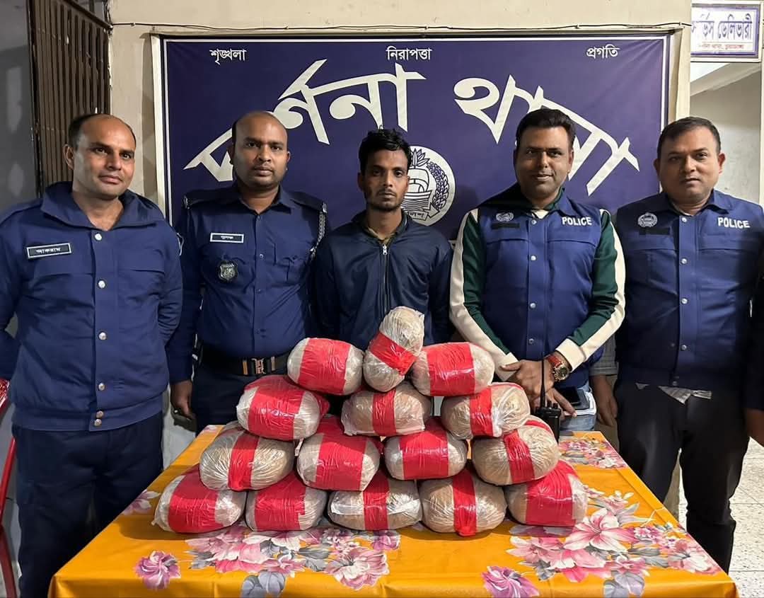 দর্শনা থানার অফিসার ইনচার্জ মুহম্মদ শহীদ তিতুমীর এর নেতৃত্বে দর্শনা থানার এসআই(নিঃ) মোঃ মাসুদুর রহমান সঙ্গীয় অফিসার ও ফোর্সসহ মাদক বিরোধী অভিযান চালায়। এসময় গোপন সংবাদের ভিত্তিতে দর্শনা থানাধীন ঝাঝাডাঙ্গা ঈদগাহ পাড়ায় সুন্নত আলীর ছেলে মোঃ হৃদয় (২৫) এর বাড়িতে অভিযান চালিয়ে বসত বাড়ীর উঠান হতে ৪লাখ ৫০ হাজার টাকা মূল্যের ১৫ কেজি গাঁজাসহ হৃদয়কে গ্রেফতার করে।গ্রেফতারকৃত আসামীর বিরুদ্ধে দর্শনা থানায় মাদকদ্রব্য আইনে মামলা হয়েছে।