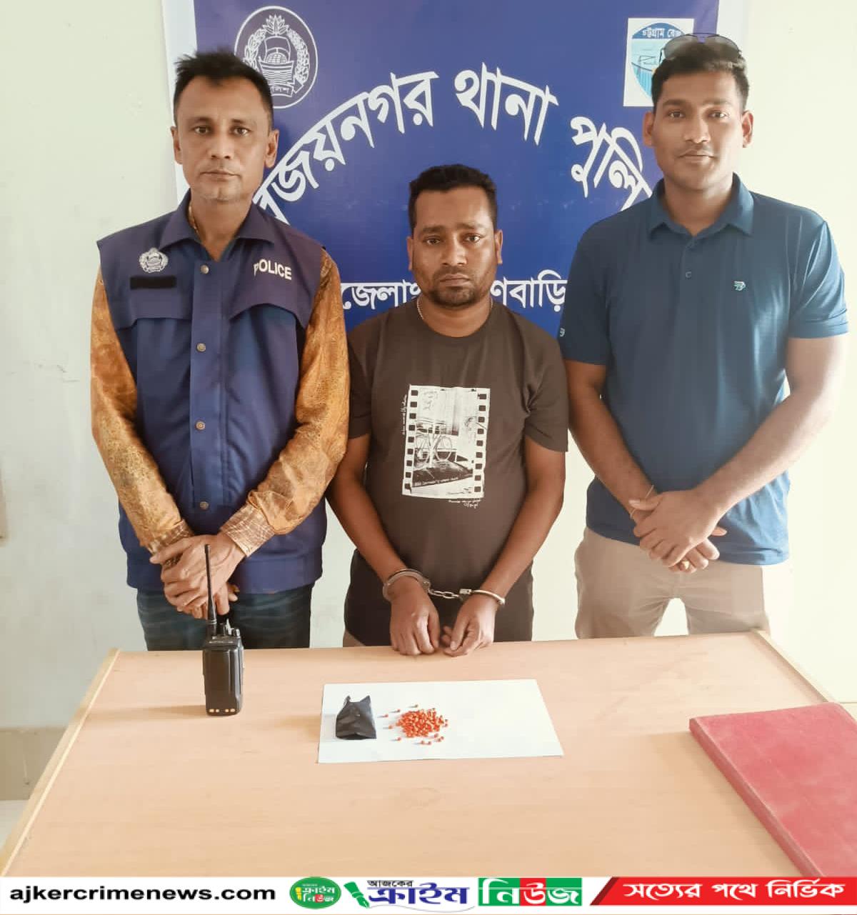 ব্রাহ্মণবাড়িয়া জেলা বিজয়নগর উপজেলা রোজ শনিবার ১৫ই মার্চ ২০২৫খ্রি. তারিখে ১২:৩০ ঘটিকার সময় এসআই(নিরস্ত্র)/মোঃ নুরুন্নবী এর নেতৃত্বে সঙ্গীয় ফোর্স সহ বিজয়নগর থানা এলাকায় মাদক উদ্ধার ও বিশেষ অভিযান পরিচালনা করা কালে বিজয়নগর থানাধীন ৮নং বিষ্ণুপুর ইউনিয়নের ছতুরপুর সাকিনে ছতরপুর চৌরাস্তার মোড় অভিযান পরিচালনা করে।