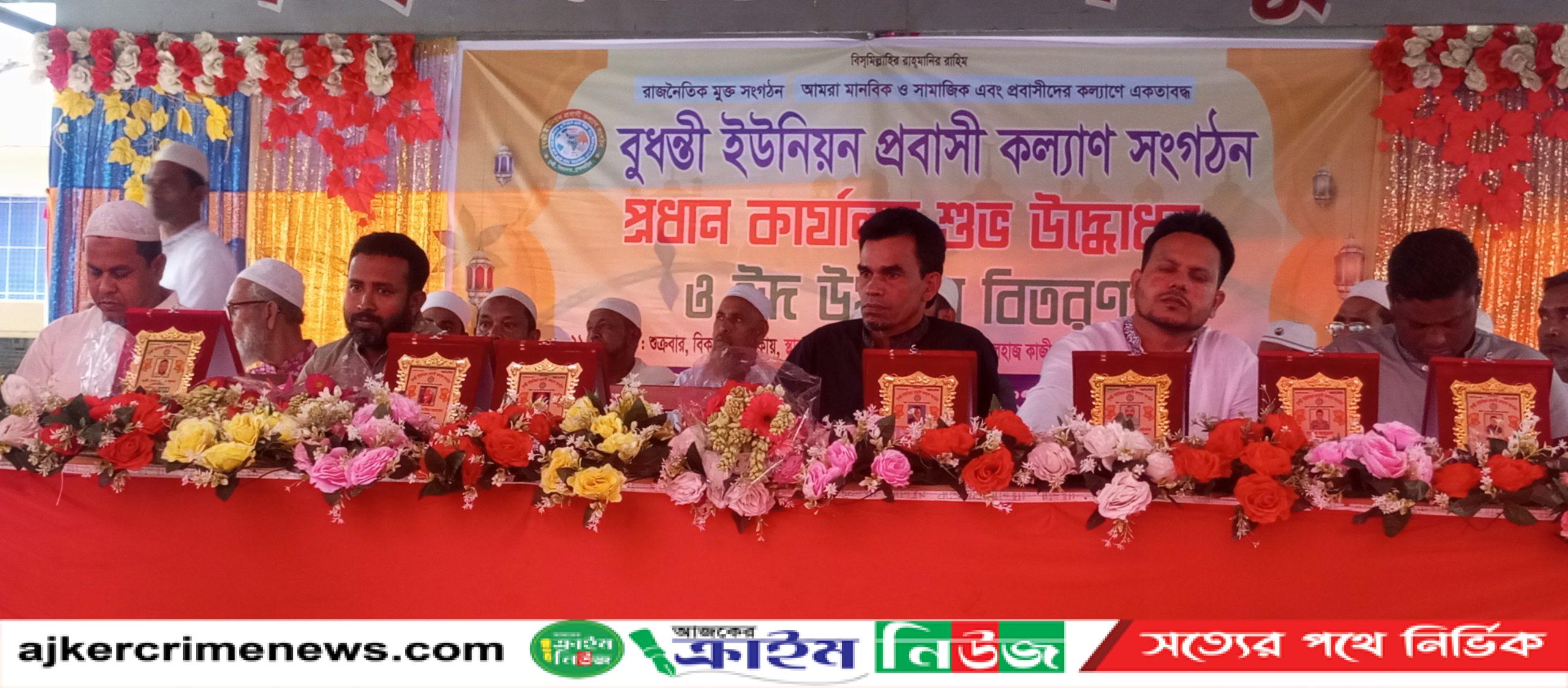 ব্রাহ্মণবাড়িয়া বিজয়নগর উপজেলার ১নং বুধন্তী ইউনিয়নের প্রবাসী কল্যাণ সংগঠনের প্রধান কার্যালয়ের শুভ উদ্বোধন উপলক্ষে ইফতার ও গরিব অসহায়দের মাঝে ঈদ উপহার বিতরণ করা হয়েছে।