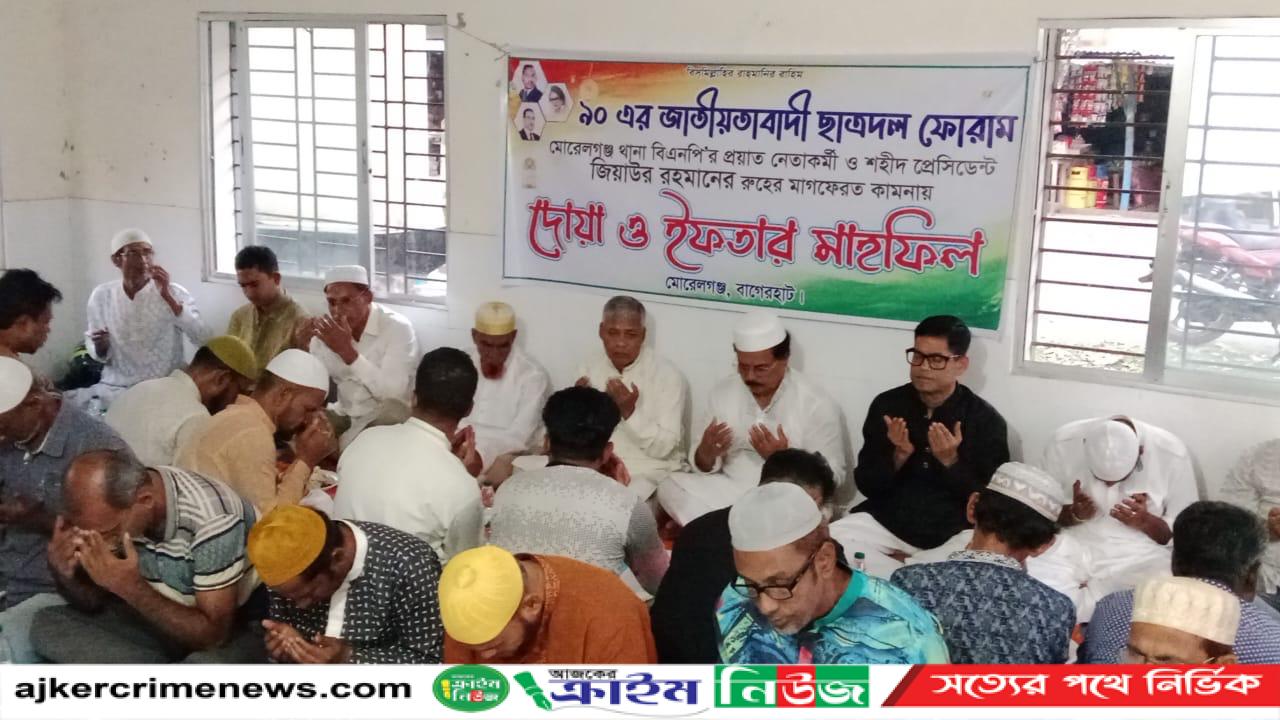 এস.এম. সাইফুল ইসলাম কবির, বাগেরহাট:বাগেরহাটের মোরেলগঞ্জে ৯০-এর জাতীয়তাবাদী ছাত্রদল ফোরামের উদ্যোগে এক দোয়া ও ইফতার মাহফিল অনুষ্ঠিত হয়েছে। এতে মোরেলগঞ্জ থানা বিএনপির প্রয়াত নেতাকর্মী ও শহীদ প্রেসিডেন্ট জিয়াউর রহমানের রুহের মাগফিরাত কামনা করা হয়।