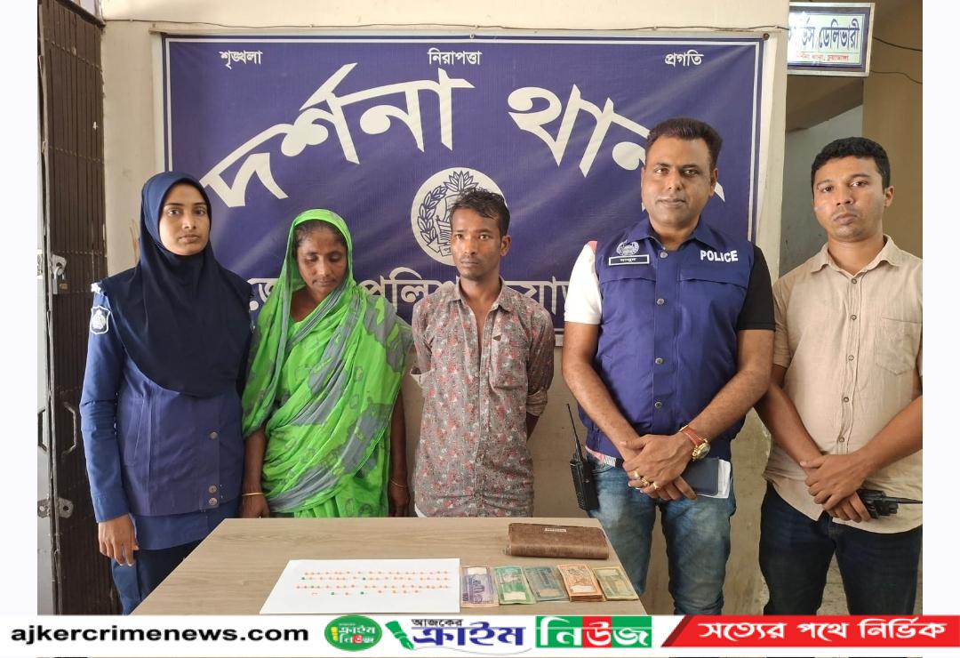 শনিবার রাত সাড়ে ১০টায় দর্শনা থানার অফিসার ইনচার্জ মুহম্মদ শহীদ তিতুমীর এর তত্বাবধানে দর্শনা থানার এসআই (নিঃ) মোঃ মাসুদুর রহমান সঙ্গীয় ফোর্সসহ দর্শনা পৌর এলাকার মোবারকপাড়ায় গোপন সংবাদের ভিত্তিতে এক মাদকবিরোধী অভিযান চালায়। এসময় মৃত আঃ কুদ্দুসের স্ত্রী মোছাঃ ডলি খাতুন (৫০) এর হেফাজত হতে অবৈধ মাদকদ্রব্য ২৫ পিচ ইয়াবা ট্যাবলেট ও মাদক বিক্রয়লব্ধ বাংলাদেশী নগদ ৬,৪০০টাকা ও শান্তিপাড়ার লুকমান মিয়ার ছেলে মোঃ বকুল মিয়া (২৮) এর হেফাজত হতে অবৈধ মাদকদ্রব্য ৩৫ পিচ ইয়াবা ট্যাবলেট উদ্ধার করে।পরে আসামীদ্বয়ের বিরুদ্ধে দর্শনা থানায় মাদকদ্রব্য আইনে মামলা করা হয়েছে।