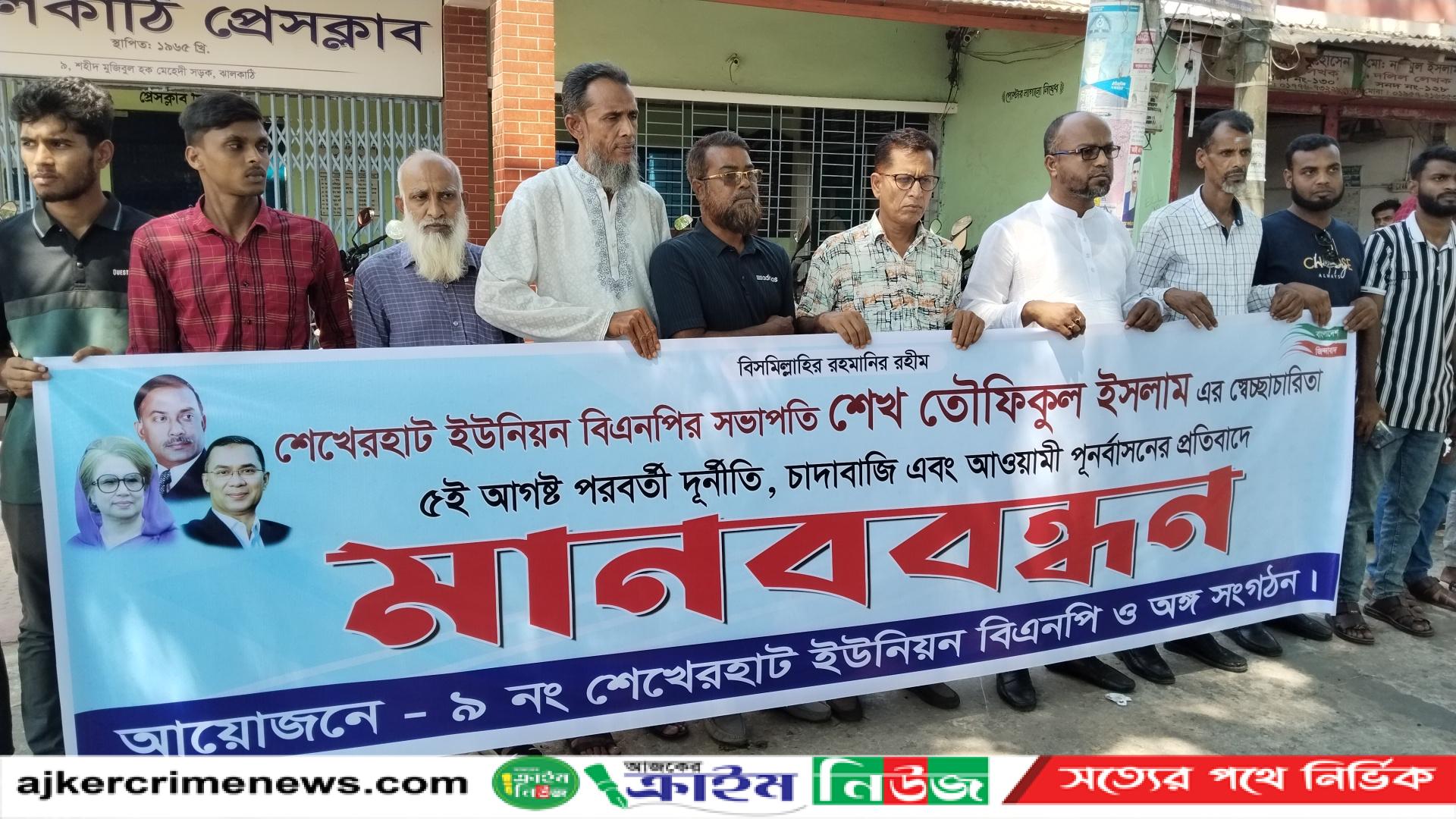 ঝালকাঠি প্রতিনিধি ঝালকাঠি সদরের ৯ন ং শেখের হাট ইউনিয়ন বিএনপির সভাপতি শেখ তৌফিকুল ইসলামের বিরুদ্ধে বুধবার ৯ এপ্রিল দুপুরে ঝালকাঠি প্রেসক্লাবের সামনে মানববন্ধন করেন শেখের হাট ইউনিয়নের বিএনপির নেতাকর্মীরা।