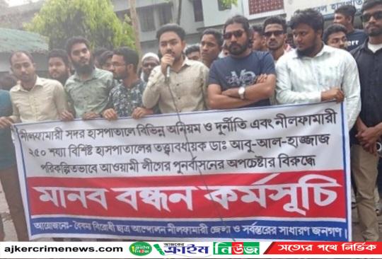 নিজস্ব প্রতিবেদক।। নীলফামারীর জেনারেল হাসপাতালের তত্ত্বাবধায়ক ডা. আবু বিন হাজ্জাজকে অপসারণে ৭২ঘন্টা সময় দিয়েছে বৈষম্য বিরোধী ছাত্র আন্দোলনের নেতারা।নির্দিষ্ট সময়ের মধ্যে তাকে অপসারণ করা না হলে কঠোর আন্দোলনের হুশিয়ারী দিয়েছেন তারা। বৃহস্পতিবার (১০এপ্রিল) দুপুরে নীলফামারী জেনারেল হাসপাতালের সামনে ঘন্টাব্যাপী মানববন্ধন কর্মসুচিতে এই ঘোষণা দেয়া হয়। বৈষম্য বিরোধী ছাত্র আন্দোলন নীলফামারী জেলা শাখার আহবায়ক সৈয়দ মেহেদী হাসান আশিকের সভাপতিত্বে ও সদস্য সচিব আলিফ সিদ্দিকী প্রান্তরের সঞ্চালনায় এসময় বক্তব্য দেন, বৈষম্য বিরোধী ছাত্র আন্দোলন জেলা শাখার যুগ্ম আহবায়ক সাইয়েদ গোলাম আজম, রইসুল ইসলাম অম্লান,সাইয়েদুজ্জামান, যুগ্ম সদস্য সচিব রেজাউল ইসলাম, ছাত্র প্রতিনিধি ইসমাইল হোসেন, জাতীয় নাগরিক পার্টির আখতারুজ্জামান।মানববন্ধনে অভিযোগ করে বক্তারা বলেন, হাসপাতালে চিকিৎসা সেবার মান অত্যন্ত খারাপ, খাবার মানও খারাপ, পর্যাপ্ত ঔষুধ পাচ্ছেন না রোগীরা। বিশেষ করে আউটসোর্সিংয়ের মাধ্যমে কর্মী নিয়োগের ক্ষেত্রে আওয়ামীলীগকে পুর্নবাসন করা হচ্ছে। আওয়ামীলীগের ঠিকাদাররাই কর্মী নিয়োগ দিচ্ছেন এই তত্বাবধায়কের সহায়তায়। হাসপাতালের এই তত্বাবধায়কের কারণে সেবার মান বাড়ছে না।রংপুরে থাকাকালীন তার বিরুদ্ধে দুর্নীতি মামলা হয়েছে এরকম একজন কর্মকর্তা কিভাবে এই হাসপাতালে এখনো বহাল আছেন।তাকে এখান থেকে সরে যেতে হবে। অন্যথায় বৃহত্তর কর্মসুচি ঘোষণা করা হবে।