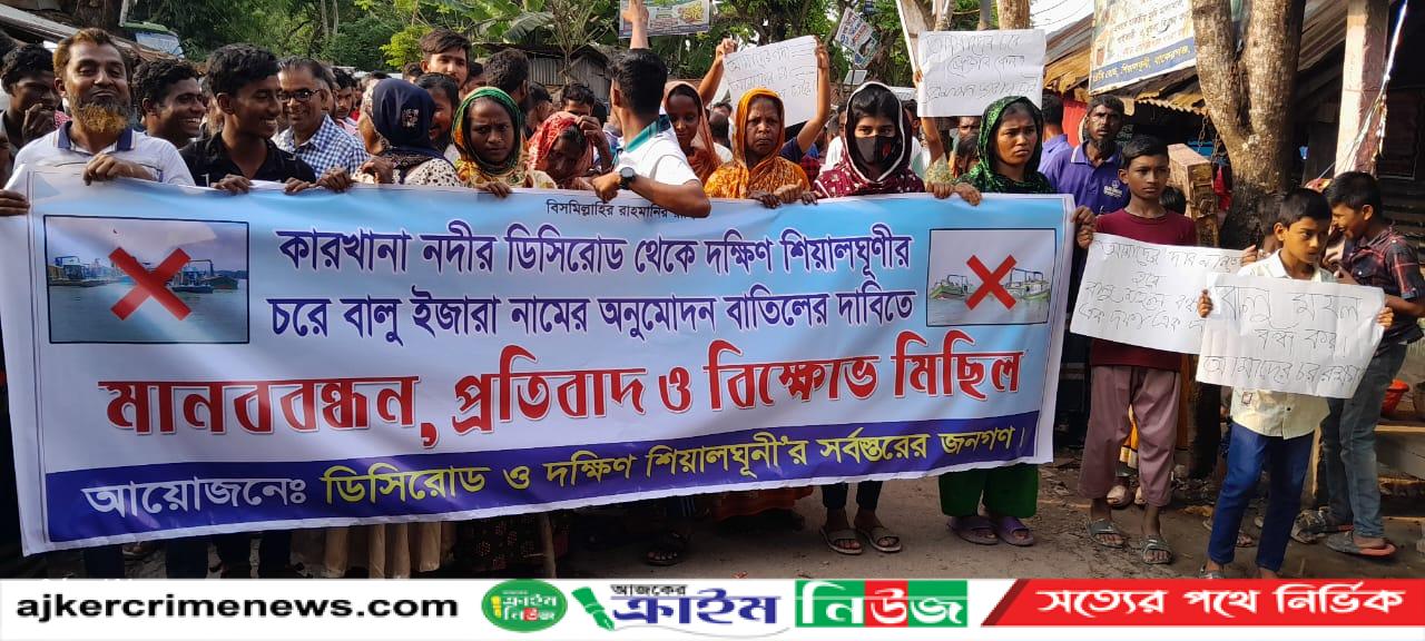 মানববন্ধনে উপস্থিত এলাকাবাসী বিক্ষোভ করে বলেন, মেসার্স অর্না এন্টারপ্রাইজের নামে আরিফুর রহমান কবিরের নেতৃত্বে কারখানা নদীর ডিসি রোড ও দক্ষিণঘুনি চড় থেকে বালু উত্তোলন করে বিক্রি করছে। প্রায় ৫-৬টি খননযন্ত্র দিয়ে কারখানা নদী থেকে বালু উত্তোলন করা হচ্ছে। অপরিকল্পিতভাবে নদীর তলদেশ থেকে বালু উত্তোলনের ফলে কারখানা নদীর তীর রক্ষা বাঁধ ও ফসলি জমি ভাঙনের মুখে পড়েছে। এর প্রতিকার চেয়ে তাঁরা অবিলম্বে কারখানা নদীতে বালুমহাল ইজারা বাতিলের দাবিতে এই কর্মসূচি পালন করেছেন।
