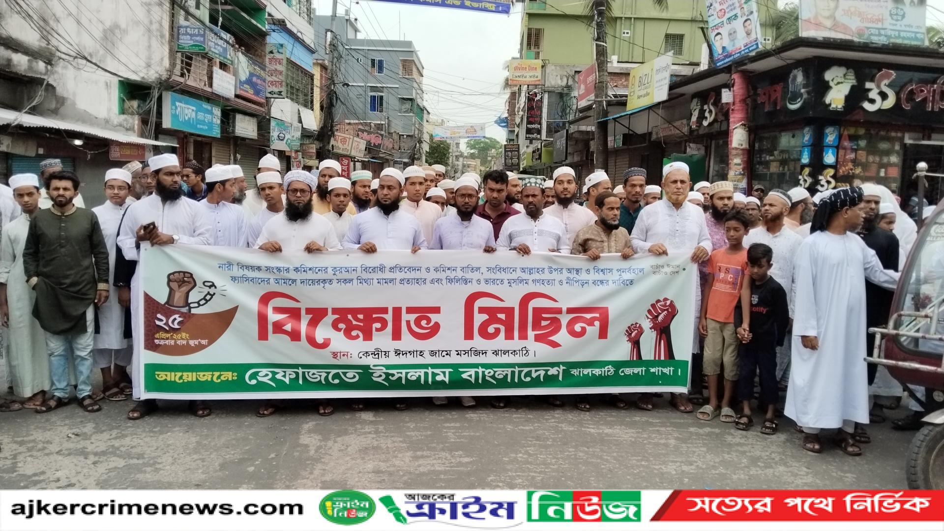মোঃ মনির হোসেন ঝালকাঠি :ঝালকাঠির কেন্দ্রীয় ঈদগাহ ময়দান থেকে শুক্রবার ২৫ এপ্রিল জুম্মার নামাজ শেষে হেফাজতে ইসলাম বাংলাদেশ, ঝালকাঠি জেলা শাখার উদ্যোগে বিক্ষোভ সমাবেশ অনুষ্ঠিত হয়।গত ১৯ এপ্রিল নারী বিষয়ক সংস্কার কমিশন কর্তৃক কুরআন বিরোধী প্রতিবেদন প্রদানের প্রতিবাদে এবং উক্ত কমিশন বাতিল, সংবিধানে আল্লাহর প্রতি আস্থা ও বিশ্বাস পুনঃস্থাপন, ফ্যাসিবাদের আমলে দায়েরকৃত মিথ্যা মামলা প্রত্যাহার, ফিলিস্তিন ও ভারতে মুসলিম গণহত্যা বন্ধের দাবিতে একটি বিক্ষোভ মিছিল বের হয়ে শহরের প্রধান প্রধান সড়ক প্রদক্ষিণ করে ফায়ার সার্ভিস মোড়ে সংক্ষিপ্ত সমাবেশের মধ্য দিয়ে শান্তিপূর্ণভাবে শেষ হয়।
