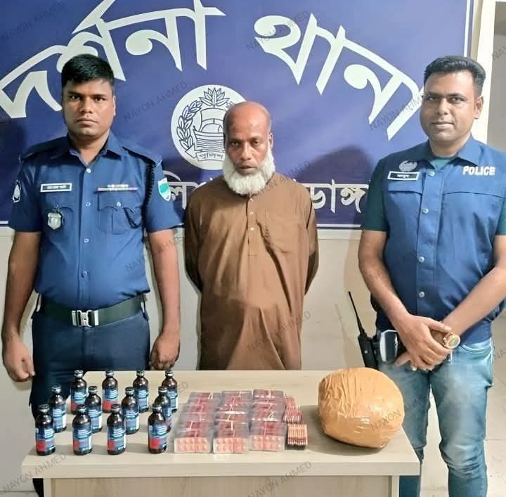 রবিবার ভোরে দর্শনা থানার অফিসার ইনচার্জ মুহম্মদ শহীদ তিতুমীর এর তত্বাবধানে দর্শনা থানার এসআই (নিঃ) মোঃ মাসুদুর রহমান সঙ্গীয় ফোর্সসহ গোপন সংবাদের ভিত্তিতে দর্শনা পৌর এলাকার মাদকের হাট খ্যাত মোহাম্মদ এলাকায় মাদকবিরোধী অভিযান চালায়। এসময় মোহাম্মদপুর চাতাল মোড় হতে গোপালগঞ্জ জেলার মুকসুদপুর থানার বেজারা ভাটরা গ্রামের লাল মিয়ার ছেলে মোঃ নজরুল ইসলাম (৫৫) কে গ্রেফতার করে। পরে তার হেফাজতে বিশেষ কায়দায় রাখা অবৈধ মাদকদ্রব্য ২হাজার৫০ পিস ট্যাপেন্টাডল ট্যাবলটে, ১ কেজি ১শ গ্রাম গাঁজা এবং ১২ বোতল ভারতীয় ফেন্সিডিল উদ্ধার করে। গ্রেফতারকৃত আসামীর বিরুদ্ধে দর্শনা থানায় মাদকদ্রব্য আইনে মামলা রুজু করা হয়েছে।এদিকে মোহাম্মদপুর বেশ কয়েকটি ভাড়া বাড়িতে দিনে রাতে ফেনসিডিল কেনাবেচা চলে বলে এলাকাবাসি ক্ষোভ প্রকাশ করেছেন।এলাকাবাসী দাবী প্রশাসন শুধু ক্রেতাদের ধরে।স্থানীয় বিক্রেতাদের ধরেনা।ধরলে এলাকায় এসব নেশাদ্রব্য কেনাবেচা বন্ধ হতো।
