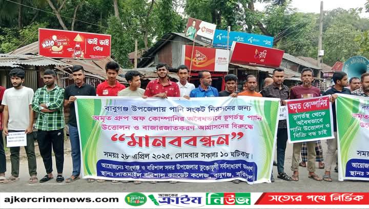 বরিশালের বাবুগঞ্জ উপজেলায় ভূগর্ভস্থ পানির স্তর বিপর্যস্ত করে খনিজ পানি উত্তোলন ও বাজারজাতের অভিযোগে অমৃত গ্রুপের বিরুদ্ধে সাতমাইল এলাকায় মানববন্ধন করেছে স্থানীয়রা।