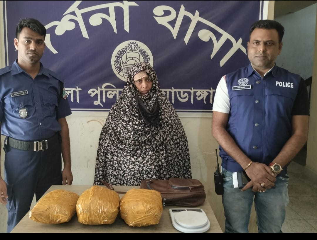 একই দিন রাত সাড়ে ১১টায় দর্শনা থানার আজমপুর গ্রামের আলম হোসেনের স্ত্রী মোছাঃ রিনা বেগম (৩৮)কে ৯০ হাজার টাকা মূল্যের ৩ কেজি গাঁজাসহ গ্রেফতার করে। গ্রেফতারকৃত ৩ আসামীকে দর্শনা থানায় মাদকদ্রব্য আইনে মামলা করা হয়।