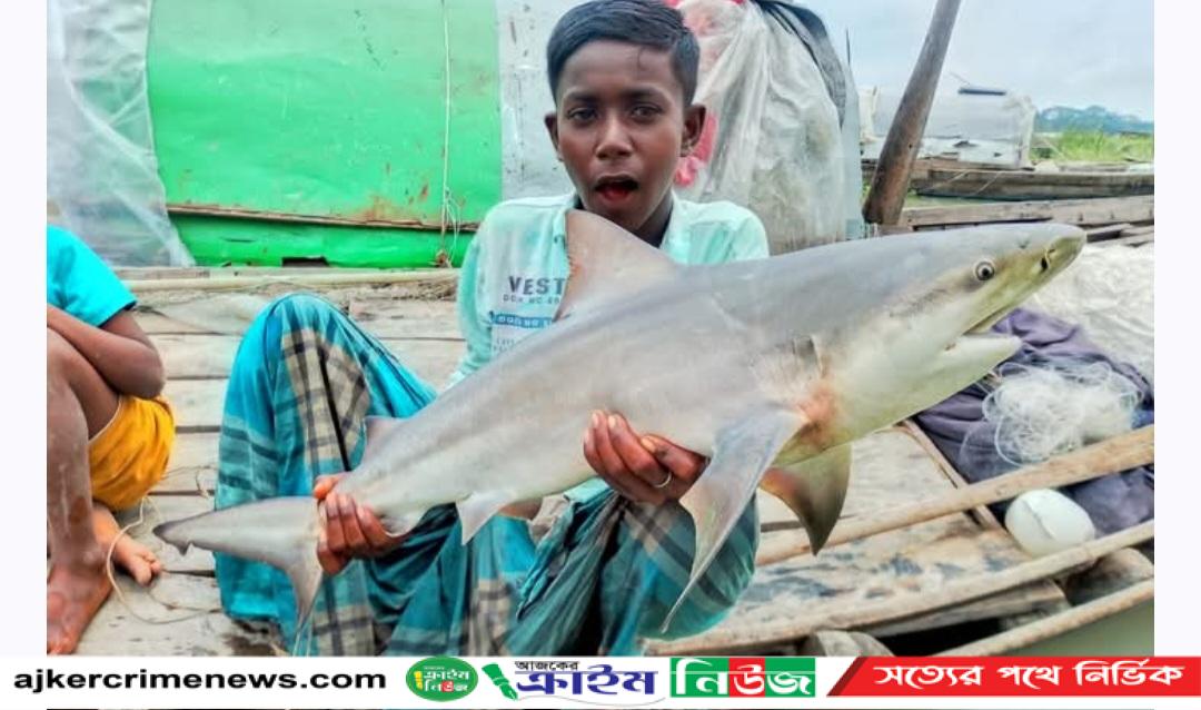 সুগন্ধা নদীতে জেলেদের জালে আটকা পড়েছে ১০ কেজি ওজনের একটি হাঙ্গর মাছ।