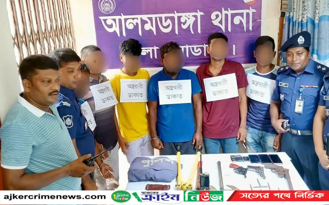 সোমবার ভোর সাড়ে ৪টায় আলমডাঙ্গা উপজেলার লক্ষীপুর বাজার এলাকায় পুলিশের একটি টিম অভিযান চালিয়ে এ ডাকাত চক্রকে গ্রেফতার করে। তারা হলো, মো. রুবেল রানা (২৯), মো. আজিজুর মন্ডল (৩৬), মো. শিলন মোল্লা (২১), মো. সবুজ আলী মিঠু (৩০), মো. মনিরুল ইসলাম (৪০) ও মো. মারুফ শেখ (২০)। এরা কুষ্টিয়া ও ঝিনাইদহ জেলার বাসিন্দা।আলমডাঙ্গা থানার পরিদর্শক (ওসি) মাসুদুর রহমান প্রেস ব্রিফিং এর মাধ্যমে সাংবাদিকদের জানান, ভোরে তিয়রবিলা পুলিশ ক্যাম্পের এসআই (নিঃ) সুকান্ত দাশ গোপন সংবাদের ভিত্তিতে জানতে পারেন, লক্ষীপুর বাজার থেকে খাসকররা যাওয়ার পাকা সড়কে একটি ডিজেল তৈলের দোকানের সামনে মাইক্রোবাসে একদল অস্ত্রধারী ডাকাত দল ডাকাতির প্রস্তুতি নিচ্ছে। খবর পেয়ে আলমডাঙ্গা থানার ওসি মাসুদুর রহমান ঘটনাস্থলে ফোর্স নিয়ে উপস্থিত হন এবং ঘিরে ফেলেন মাইক্রোবাসটি। পুলিশের উপস্থিতি টের পেয়ে ডাকাতরা নিজেদের ডিবি পুলিশ পরিচয় দিলেও সন্দেহজনক আচরণে পুলিশ তাদের জিজ্ঞাসাবাদ করে এবং একপর্যায়ে ডাকাত দল আক্রমণাত্মক হলে সবাইকে গ্রেপ্তার করে।পরে তাদের কাছ থেকে