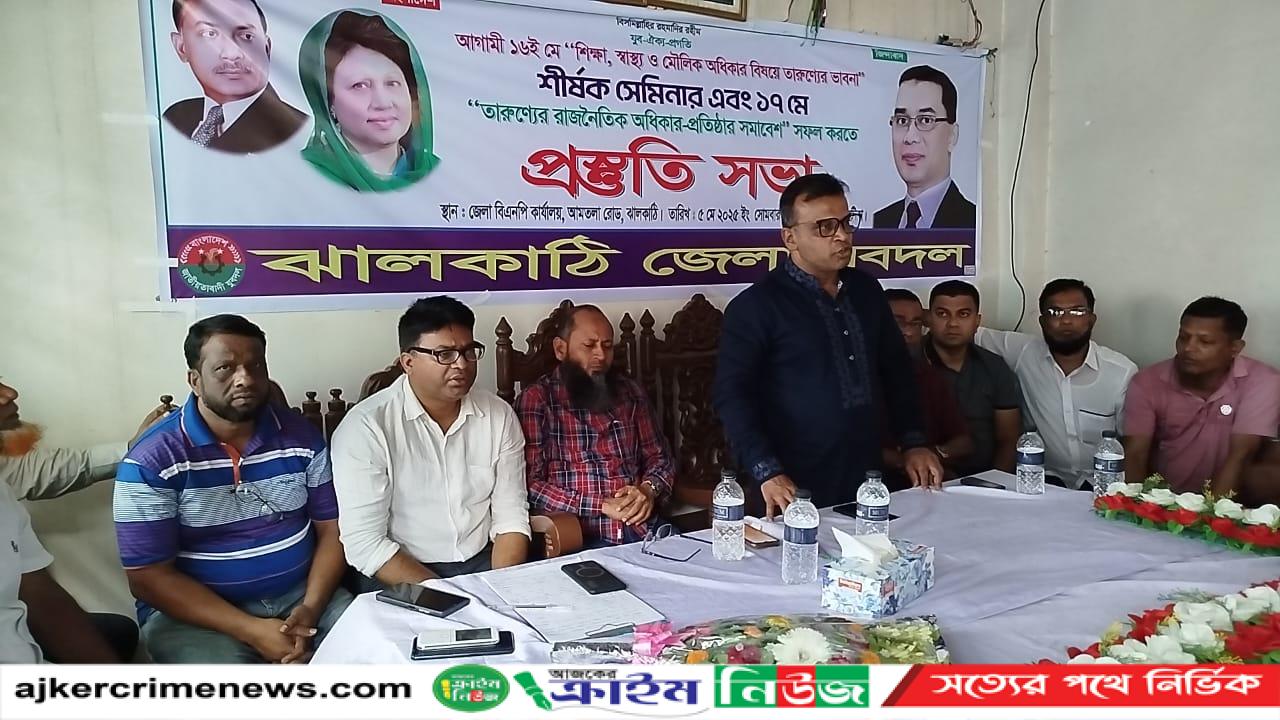 ঝালকাঠি প্রতিনিধি :ঝালকাঠি শহরের বিএনপির দলীয় কার্যালয়ে জেলা যুবদলের উদ্যোগে খুলনায় অনুষ্ঠিতব্য আগামী ১৬ মে ২০২৫ শিক্ষা, স্বাস্থ্য ও মৌলিক অধিকার বিষয়ে তারুণ্যের ভাবনা শীর্ষক সেমিনার এবং ১৭ মে ২০২৫ তারিখ তারুণ্যের রাজনৈতিক অধিকার প্রতিষ্ঠার সমাবেশ সফল করার লক্ষ্যে সোমবার ৫ মে সকালে প্রস্তুতি সভা অনুষ্ঠিত হয়।