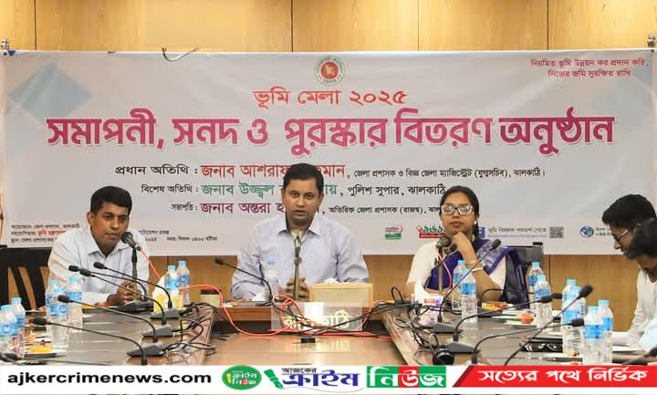 ঝালকাঠি প্রতিনিধি: ঝালকাঠি জেলা প্রশাসকের কার্যালয়ের সম্মেলন কক্ষে মঙ্গলবার ২৭ মে আয়োজিত হয় ভূমি মেলার সমাপনী, সনদ ও পুরস্কার বিতরণ অনুষ্ঠান।