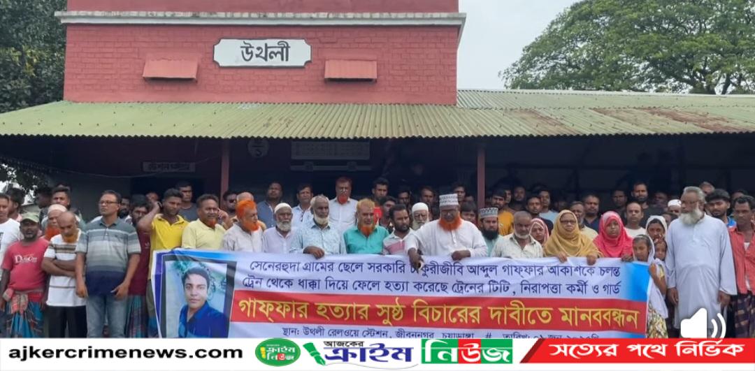 রবিবার সকাল সাড়ে৯ টায় উথলী ইউনিয়নবাসী ও শো'কার্ত পরিবারের আয়োজনে উথলী রেলস্টেশনের প্লাটফর্মে এ মানববন্ধনে কয়েক'শ নারীপুরুষ অংশগ্রহণ করে। এসময় খুলনা থেকে ছেড়ে আসা রাজশাহীগামী ৭১৫ আপ কপোতাক্ষ এক্সপ্রেস ট্রেনটি বেশ কিছুক্ষণ উথলী রেলস্টেশনে আটকে রাখা হয়। উল্লেখ্য গাফফার আলী ওরফে আকাশ(২৯) উথলী ইউনিয়নের সেনেরহুদা গ্রামের জিন্নাত আলীর ছেলে। তিনি চুয়াডাঙ্গা পানি উন্নয়ন বোর্ডে চাকরি করতেন।পরিবারের দাবী গত ২১ মে কর্মস্থল চুয়াডাঙ্গা থেকে বাড়ি ফেরার সময় রাজশাহী থেকে ছেড়ে আসা খুলনাগামী কপোতাক্ষ ট্রেনের ঙ বগি থেকে ফেলে দিয়ে আকাশকে হত্যা করা হয়। এসময়
