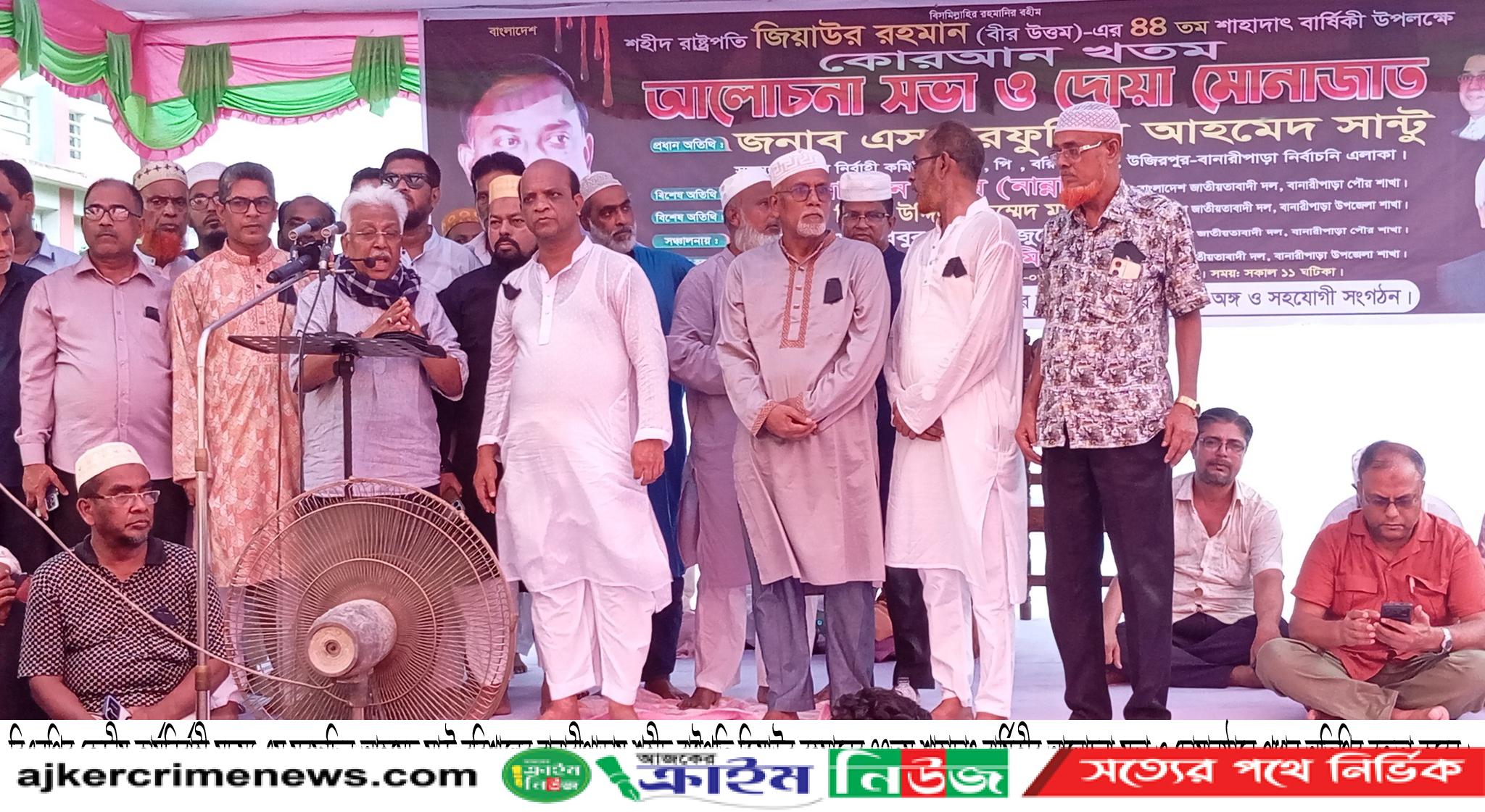রাহাদ সুমন,বিশেষ প্রতিনিধি ॥ বিএনপির কেন্দ্রীয় কার্যনির্বাহী কমিটির অন্যতম সদস্য দানবীর এস. সরফুদ্দিন আহমেদ সান্টু বলেছেন,বহুদলীয় গণতন্ত্রের প্রবর্তক শহীদ রাষ্ট্রপতি জিয়াউর রহমান বীর উত্তমের মত দেশ প্রেমিক সৎ ও সাহসী রাষ্ট্রনায়ক ও রাজনীতিক বিরল। মাত্র অল্প সময় দেশ শাসনের সুযোগ পেয়েও তিনি তার সৎকর্মগুনে দেশের আপামর মানুষের “হৃদয়ের মধ্যমনি” হয়ে আজও দেদীপ্যমান হয়ে আছেন। বরিশালের বানারীপাড়ায় উপজেলা ও পৌর বিএনপি এবং এর অঙ্গ সহযোগী সংগঠনের উদ্যোগে শহীদ রাষ্ট্রপতি জিয়াউর রহমানের ৪৪তম শাহাদাত বার্ষিকী উপলক্ষে অনুষ্ঠিত আলোচনাসভা ও দোয়া-মিলাদ অনুষ্ঠানে প্রধান অতিথির বক্তৃতায় তিনি এসব কথা বলেন। সোমবার (২ জুন) সকাল ১০ টায় বানারীপাড়া বালিকা মাধ্যমিক বিদ্যালয় মাঠে উপজেলা বিএনপির আহবায়ক শাহ আলম মিঞার সভাপতিত্বে ও পৌর বিএনপির সদস্য সচিব হাবিবুর রহমান জুয়েলের প্রাণবন্ত সঞ্চলনায় এ আলোচনা সভা ও দোয়া-মিলাদ অনুষ্ঠিত হয়। অনুষ্ঠানে বিশেষ অতিথি ছিলেন উপজেলা বিএনপির সদস্য সচিব রিয়াজ আহমেদ মৃধা ও পৌর বিএনপির আহবায়ক আহসান কবির নান্না হাওলাদার। এ সময় আরো উপস্থিত ছিলেন উপজেলা বিএনপির সাবেক সাধারণ সম্পাদক গোলাম মাহমুদ মাহবুব মাষ্টার,উপজেলা বিএনপির যুগ্ম আহবায়ক আবু হানিফ হাওলাদার,রুহুল আমিন মল্লিক,জাহাঙ্গীর হোসেন ও সবুর খান,পৌর বিএনপির সিনিয়র যুগ্ম আহবায়ক আঃ সালাম,যুগ্ম আহবায়ক শফিকুল ইসলাম রিপন ও দেলোয়ার হোসেন মল্লিক,উপজেলা যুবদলের আহবায়ক সাব্বির আহমেদ সুমন হাওলাদার,সদস্য সচিব মিজান ফকির,উপজেলা স্বেচ্ছাসেবকদলের আহবায়ক সাইদুল ইসলাম,উপজেলা ছাত্রদলের আহবায়ক রুবেল হাওলাদার, সদস্য সচিব মো. সোহাগ,পৌর যুবদলের সদস্য সচিব জাহিন মাহমুদ,সাংবাদিক সোহেল মাহাবুব প্রমুখ। এছাড়াও বানারীপাড়া পৌরসভা ও বিভিন্ন ইউনিয়নের বিএনপি এবং এর অঙ্গ সহযোগী সংগঠনের কয়েক হাজার নেতা-কর্মী ও সমর্থক অনুষ্ঠানে উপস্থিত ছিলেন। আলোচনা শেষে শহীদ রাষ্ট্রপতি জিয়াউর রহমানের রুহের মাগফেরাত এবং বিএনপি চেয়ারপার্সন ও সাবেক প্রধানমন্ত্রী বেগম খালেদা জিয়া ও দলের ভারপ্রাপ্ত চেয়ারম্যান তারেক রহমানের সুস্বাস্থ্য এবং দীর্ঘায়ু কামনায় দোয়া-মোনাজাত অনুষ্ঠিত হয়। পরে সবার মাঝে খাবার বিতরণ করা হয়। ###