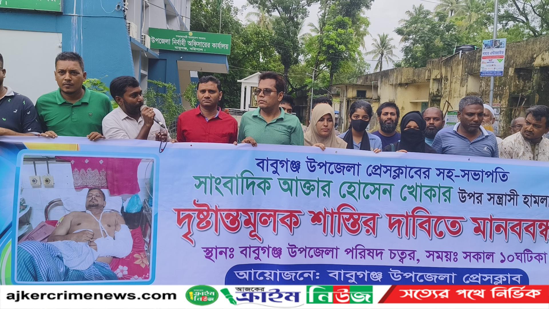 বুধবার সকালে বাবুগঞ্জ উপজেলা পরিষদের সামনে বাবুগঞ্জ উপজেলা প্রেসক্লাব'র আয়োজনে ঘন্টাব্যাপি অনুষ্ঠিত মানববন্ধনে বক্তারা হামলায় জড়িতদের বিরুদ্ধে দ্রুত মামলা নিয়ে গ্রেফতার পূর্বক শাস্তির দাবি জানিয়েছেন। বাবুগঞ্জ উপজেলা প্রেসক্লাব'র সভাপতি সহকারী অধ্যাপক সাইফুল রহিম এর সভাপতিত্বে ও সাবেক সভাপতি সাইফুল ইসলাম এর সঞ্চালনায় বক্তব্য রাখেন প্রেসক্লাবের সাবেক সাধারণ সম্পাদক উপজেলা জামায়াতের আমীর মাওলানা রফিকুল ইসলাম, বিমানবন্দর প্রেসক্লাবের সভাপতি সিনিয়র সাংবাদিক আরিফ আহাম্মেদ মুন্না, বাবুগঞ্জ প্রেসক্লাবের সাধারণ সম্পাদক আরিফ হোসেন, সিনিয়র সহ সভাপতি হাফেজ মুহাম্মাদ সাইফুল ইসলাম, সহ সভাপতি মোস্তাফিজুর রহমান টুলু, সাবেক সাধারণ সম্পাদক আরিফ হোসেন, শফিকুল ইসলাম, আহত আক্তার হোসেন খোকার বোন লাভলী আক্তার প্রমুখ। এসময় উপস্থিত ছিলেন প্রেসক্লাবের সাংগঠনিক সম্পাদক আরিফ হোসেন, দপ্তর সম্পাদক আল আমিন, সহ সাংগঠনিক রফিকুল ইসলামসহ সদস্যবৃন্দ।