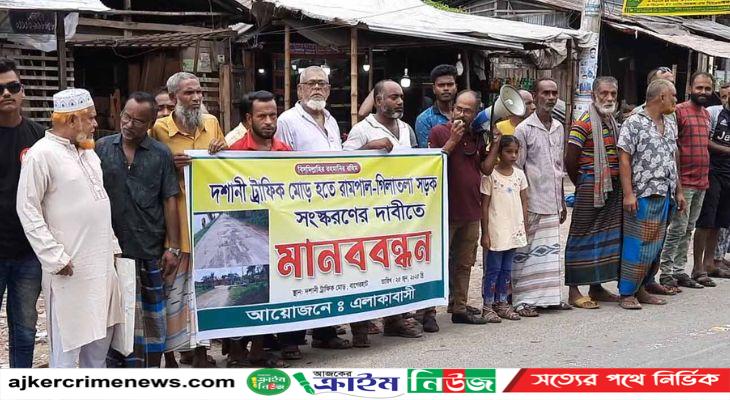 বুধবার (২৫ জুন) দুপুরে বাগেরহাট শহরের দশানী ট্রাফিক মোড় এলাকায় জড়ো হয়ে তারা মানববন্ধন করেন। মানববন্ধনকারীরা ঠিকাদারী প্রতিষ্ঠান মাহবুব ব্রাদার্সের কার্যাদেশ বাতিল করে, নতুন ঠিকাদার নিয়োগ দিয়ে অতিদ্রুত কাজ সমাপ্তের দাবি জানানা। অন্যথায় আরও কঠোর আন্দোলনের হুশিয়ারী দেন স্থানীয়রা।