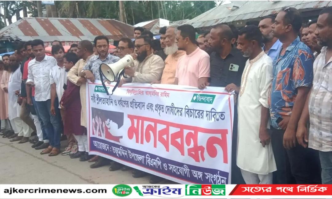 ভোলার তজুমদ্দিনে স্বামীকে বেঁধে রেখে স্ত্রীকে ধর্ষণের মর্মান্তিক ঘটনার প্রতিবাদে এবং প্রকৃত দোষীদের শাস্তির দাবিতে বিক্ষোভ মিছিল ও মানববন্ধন অনুষ্ঠিত হয়েছে।