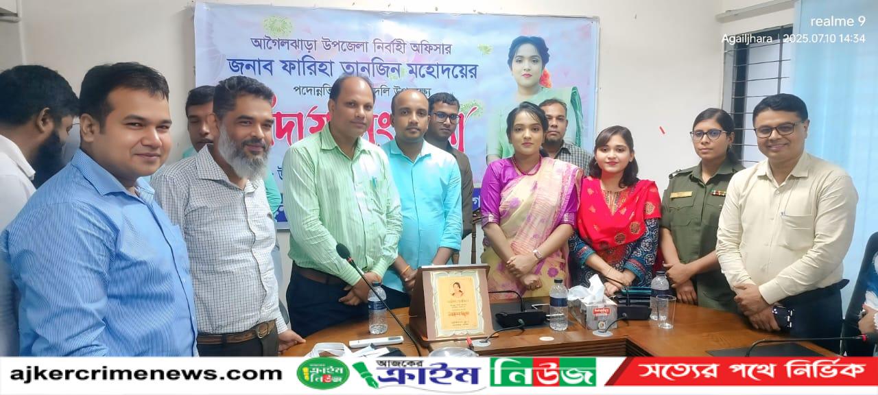 পদোন্নতি জনিত বিদায়ী সংবর্ধনায় উপস্থিত কর্মকর্তা ও কর্মচারী সকলের চোখ ছিলো অশ্রুসিক্ত। সেই অশ্রুসিক্ত নয়নে বরিশালের আগৈলঝাড়া উপজেলার চৌকস নির্বাহী অফিসার ফারিহা তানজিনকে ১০ জুলাই বৃহস্পতিবার দুপুরে বিদায়ী সংবর্ধনা দেওয়া হয়েছে। দীর্ঘদিন একসাথে কাজ করা কর্মকর্তাদের কাছ থেকে অশ্রুসিক্ত বিদায়ী সংবর্ধনা পেয়ে অনেকটা আপ্লুত হয়ে পরেছিলেন সংবর্ধিত উপজেলা নির্বাহী অফিসার ও বর্তমানে এসিডি হিসেবে পদোন্নতী পাওয়া চৌকস নারী কর্মকর্তা ফারিহা তানজিন। উপজেলা পরিষদের সভাকক্ষে অফিসার্স ক্লাবের আয়োজনে সংবর্ধনা অনুষ্ঠানে প্রধান অতিথি ছিলেন বিদায়ী উপজেলা নির্বাহী অফিসার ফারিহা তানজিন। বক্তব্য রাখেন উপজেলা সহকারী কমিশনার (ভূমি) উম্মে ইমামা বানিন, কৃষি কর্মকর্তা পিজুষ রায়, অফিসার্স ক্লাবের সাধারণ সম্পাদক ও সমাজসেবা কর্মকর্তা সুশান্ত বালাসহ অন্যান্যরা।