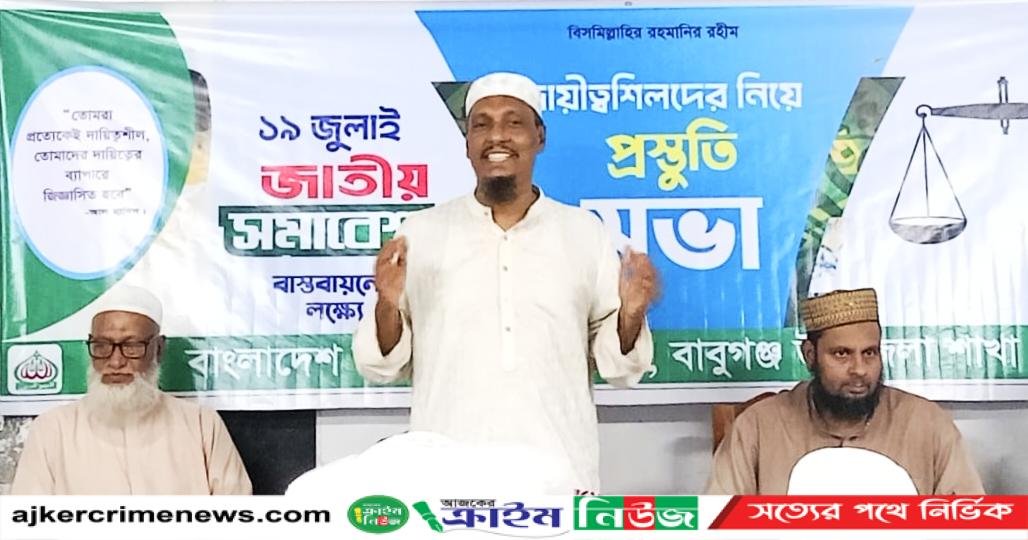 (১১ জুলাই)শুক্রবার বিকাল ৪ ঘটিকায় বাবুগঞ্জ ডিগ্রি কলেজ হলরুমে আয়োজিত এ প্রস্তুতি সভায় বাংলাদেশ জামায়াতে ইসলামী বাবুগঞ্জ উপজেলা শাখার আমীর মুহাম্মদ রফিকুল ইসলাম এর সভাপতিত্বে ও সেক্রেটারি মাওলানা আব্দুস সালাম মাঝি এর সঞ্চালনায়