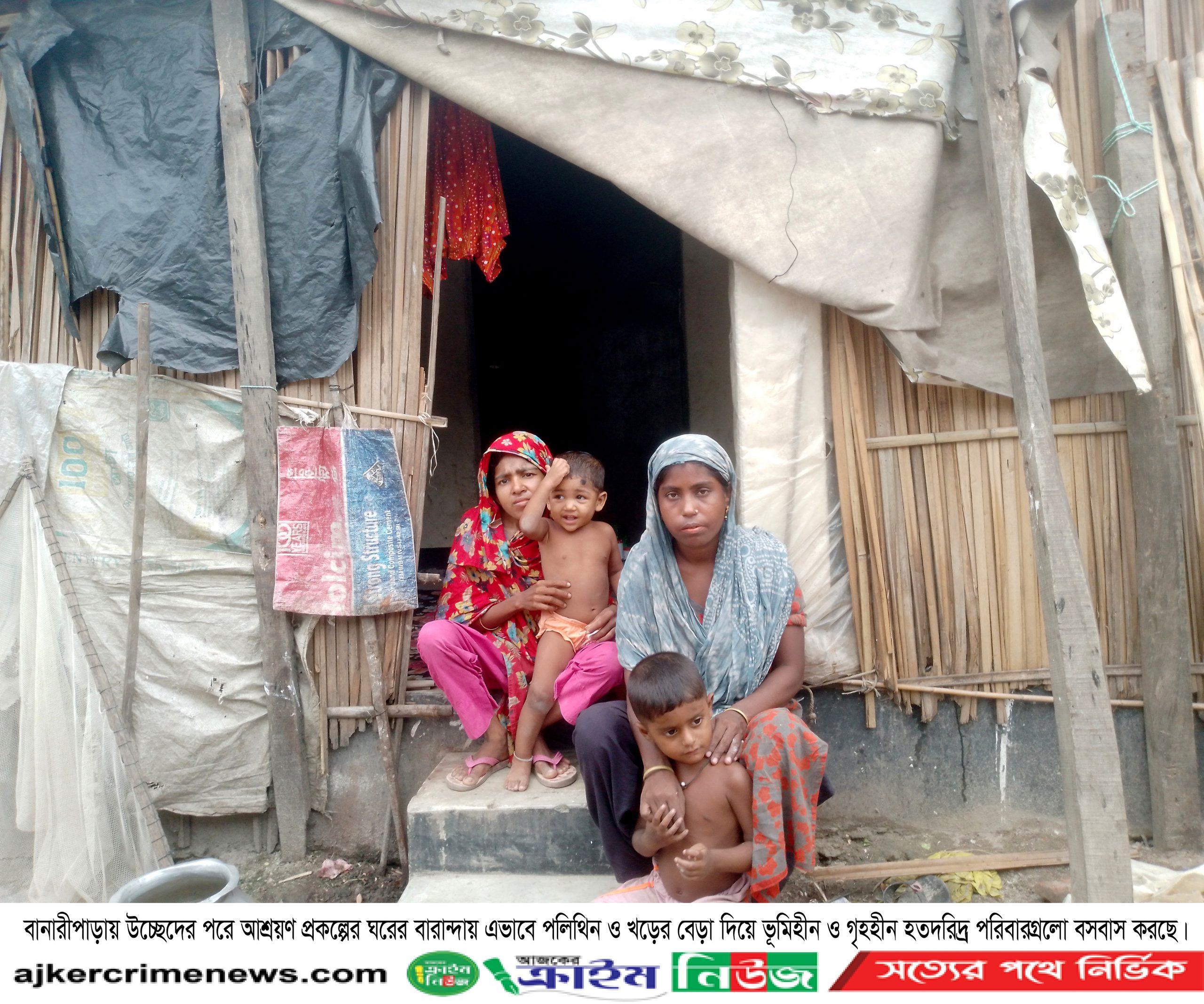 প্রসঙ্গত ২০২৩ সালের ২২ মার্চ,তৎকালীণ প্রধানমন্ত্রী শেখ হাসিনার আশ্রয়ণ প্রকল্পের আওতায় বরিশালের বানারীপাড়াকে ‘ভূমিহীন ও গৃহহীনমুক্ত’ ঘোষণা করা হয়। সেই ঘোষণার দেড় বছরের মাথায় ২০২৪ সালের ৩১ ডিসেম্বর সন্ধ্যার দিকে উপজেলার সলিয়াবাকপুর ইউনিয়নের খেজুরবাড়ি আবাসনে উচ্ছেদ অভিযানে নামে বানারীপাড়া উপজেলা প্রশাসন। উপজেলা নির্বাহী কর্মকর্তা ও নির্বাহী ম্যাজিষ্ট্রেট মো. বায়েজিদুর রহমান এ অভিযানের নেতৃত্ব দেন । এ প্রসঙ্গে উপজেলা নির্বাহী কর্মকর্তা মো. বায়েজিদুর রহমান জানান, আবাসনের ওই ৩১টি পরিবার দীর্ঘদিন ধরে বৈধ দলিল ছাড়াই সরকারি ঘরগুলো দখল করে বসবাস করেছে। তারা যে মালিকানা দাবি করে কাগজপত্র দেখাচ্ছে, তা একেবারেই গ্রহণযোগ্য নয়। এর আগেও তাদের একাধিকবার ঘর ছেড়ে দেওয়ার নির্দেশ দেওয়া হয়েছিল, কিন্তু তারা তা মানেনি। ফলে উপজেলা প্রশাসন বাধ্য হয়ে এসব ঘরে তালা লাগানোর সিদ্ধান্ত গ্রহণ করে এবং তা বাস্তবায়ন করে। উচ্ছেদের শিকার ভুক্তভোগীদের অভিযোগ, কোনো ধরনের পূর্ব ঘোষণা বা লিখিত নোটিশ ছাড়াই খেজুরবাড়ি আবাসনের ৩১টি পরিবারকে হঠাৎ করে ঘর থেকে বের করে দিয়ে তালা লাগিয়ে দেয় উপজেলা প্রশাসন। ঘরের ভেতরে রয়ে যায় ওইসব পরিবারের সদস্যদের খাবার, কাপড়-চোপড়, এমনকি গুরুত্বপূর্ণ জিনিসপত্রও। কোথাও একটু থাকার জায়গার ঠাঁই না পাওয়ায় বিগত ছয়টি মাস এসব হতদরিদ্র পরিবার তালাবদ্ধ আশ্রয়নের ঘরের সামনে পলি-খড় দিয়ে বেড়া দিয়ে অস্থায়ীভাবে বসবাস করছেন। শীত, ঝড়, বৃষ্টি বা বন্যা-জলোচ্ছ্বাসের মধ্যেও ছোট ছোট সন্তানদের নিয়ে এই দুঃসহ জীবনযাপন এখন তাদের নিত্যদিনের করুন বাস্তবতা। ভুক্তভোগীরা বলেন, “আমরা তো অশিক্ষিত মানুষ। যখন ঘরের জন্য আবেদন করেছিলাম, তখন আমাদের একটি সাদা কাগজে ‘স্থায়ীভাবে বসবাসের অনুমতিপত্র’ দেয়া হয়েছিল, যেখানে তৎকালীন ইউএনও ও চেয়ারম্যানের স্বাক্ষর ছিল। আমরা ভেবেছিলাম এটাই বুঝি আমাদের মালিকানা দলিল। এখন প্রশাসন বলছে এই কাগজ অগ্রহণযোগ্য। ফলে এখন আমরা নতুন করে আবারও সরকারের কাছে সহানুভূতির আবেদন করেছি।