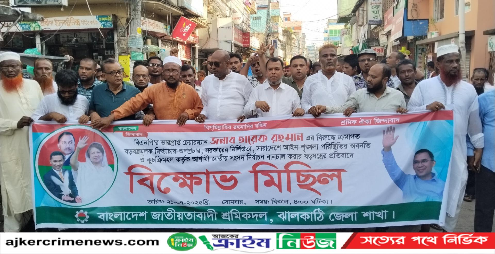 ঝালকাঠি প্রতিনিধি:ঝালকাঠি জেলা শ্রমিক দলের উদ্যোগে রবিবার বিকেলে জেলা বিএনপির কার্যালয়ের সামনে থেকে বিএনপি'র ভারপ্রাপ্ত চেয়ারম্যান তারেক রহমান এর বিরুদ্ধে ক্রমাগত ষড়যন্ত্রমূলক মিথ্যাচার-অপপ্রচার, সরকারের নির্লিপ্ততা, সারাদেশে আইন-শৃঙ্খলা পরিস্থিতির অবনতি ও কুচক্রিমহল কর্তৃক আগামী জাতীয় সংসদ নির্বাচন বানচাল করার ষড়যন্ত্রের প্রতিবাদে বিক্ষোভ মিছিল অনুষ্ঠিত হয়।