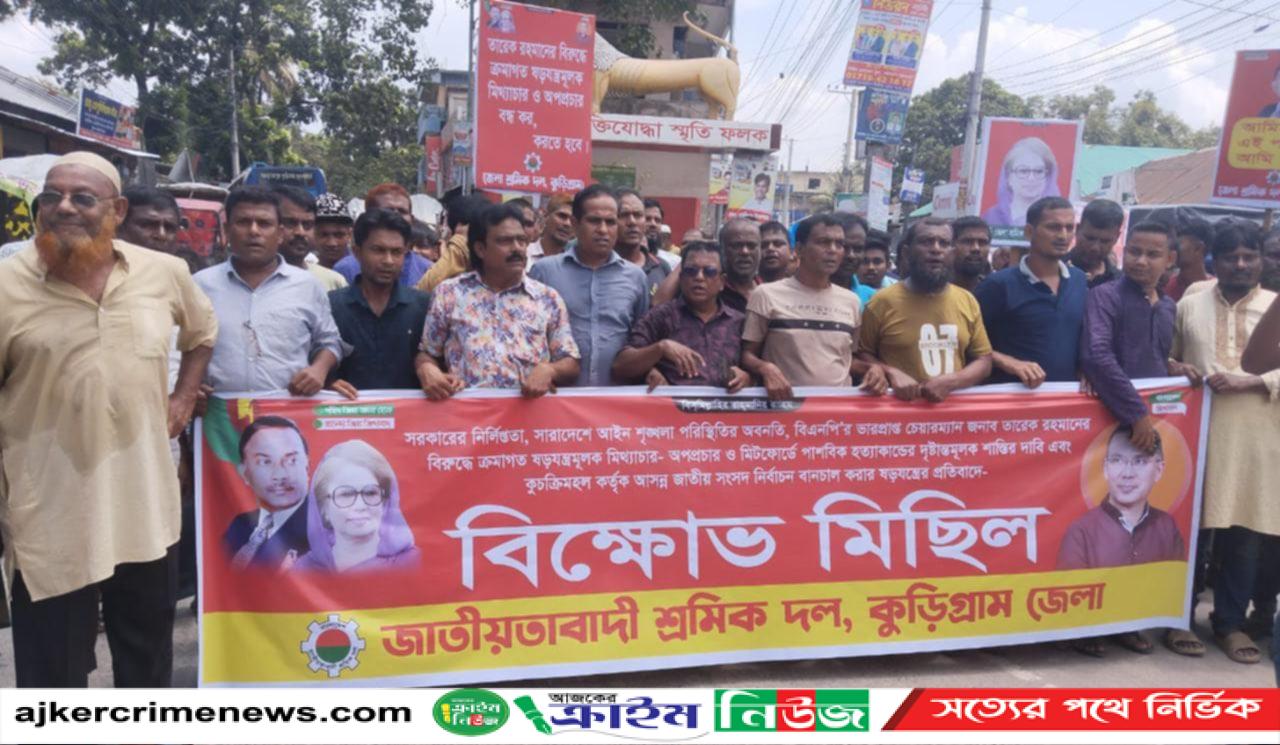 সারাদেশে আইনশৃঙ্খলা পরিস্থিতির অবনতি এবং বিএনপির ভারপ্রাপ্ত চেয়ারম্যান তারেক রহমানের বিরুদ্ধে কটুক্তির প্রতিবাদে কুড়িগ্রামে বিক্ষোভ মিছিল করেছে জেলা শ্রমিক দল।