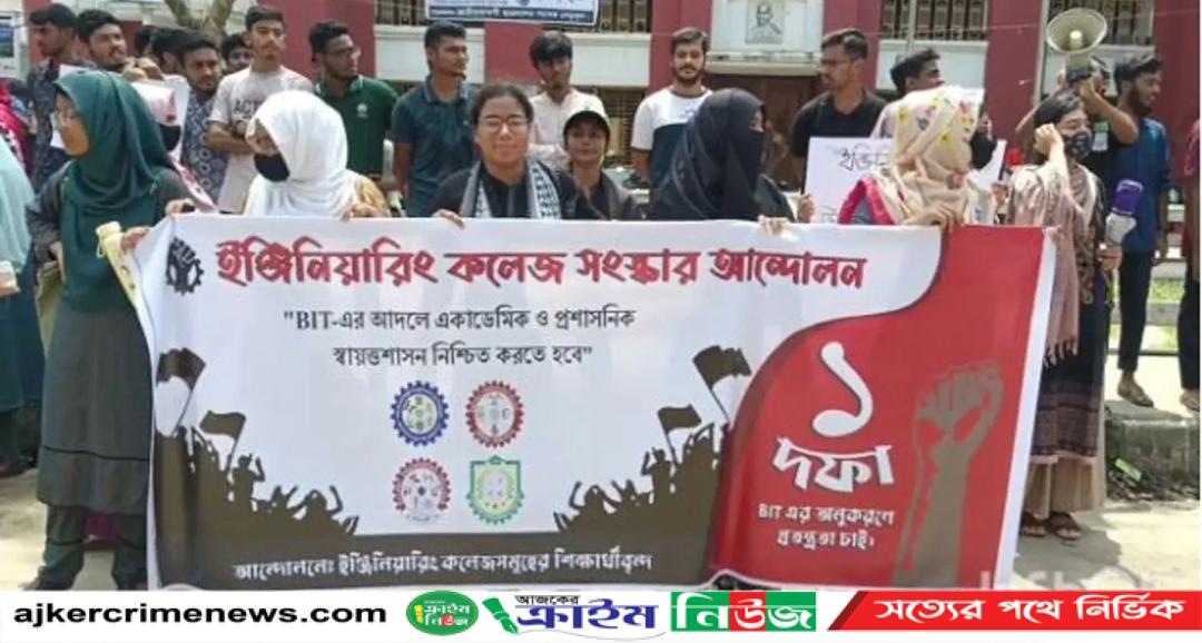 ঢাকা বিশ্ববিদ্যালয়ের অধিভুক্তি কাঠামো বাতিল করে বাংলাদেশ ইনস্টিটিউট অফ টেকনোলজি মডেলের আদলে স্বতন্ত্রতা নিশ্চিতের এক দফা দাবিতে বিক্ষোভ সমাবেশ করেছে ইঞ্জিনিয়ারিং কলেজের শিক্ষার্থীরা। বুধবার (২৩ জুলাই) বেলা সাড়ে ১১টায় নগরীর সদর রোডের অশ্বিনী কুমার হলের সামনে বিক্ষোভ করে তারা।