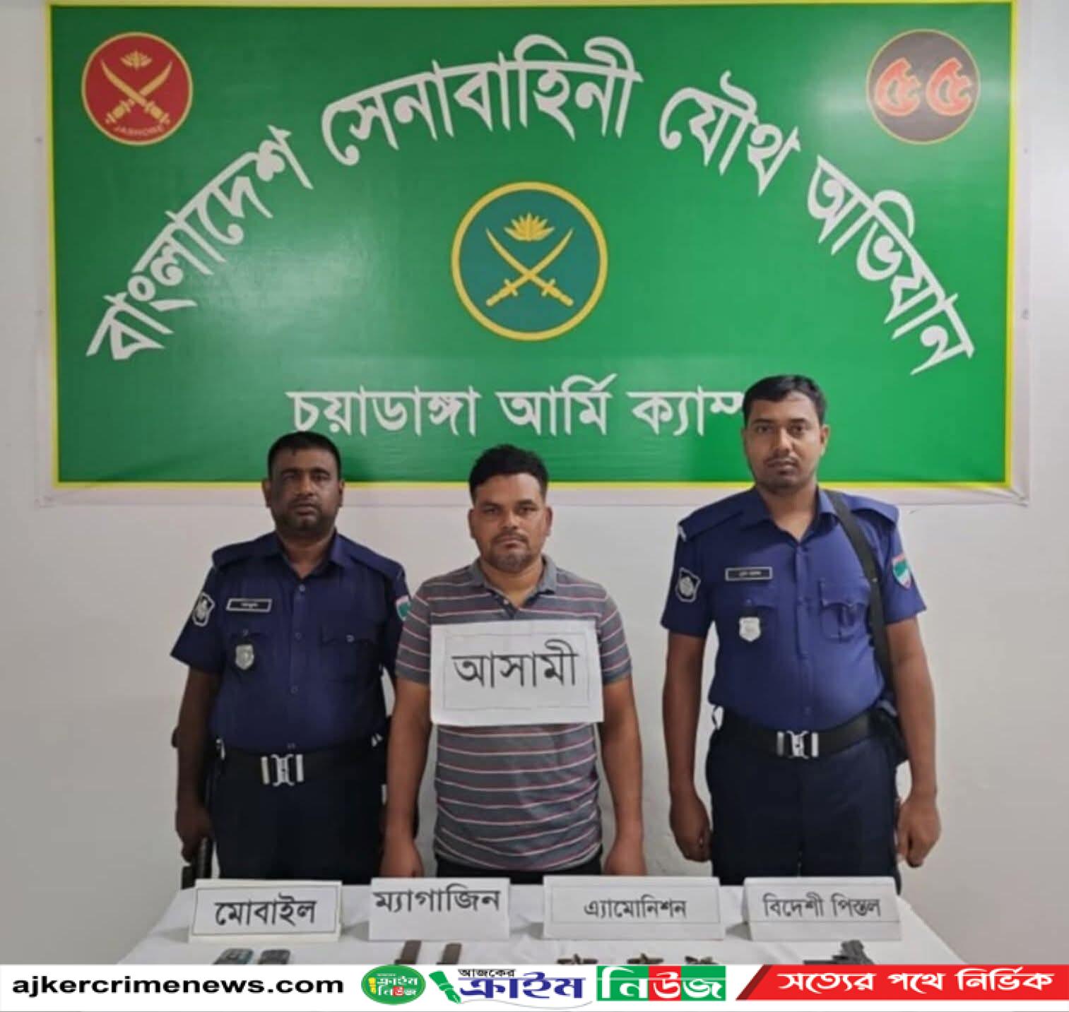 বৃহস্পতিবার ভোর সাড়ে ৪টার দিকে দামুড়হুদা উপজেলার দশমী ব্রিজপাড়ার মৃত কিয়াম উদ্দিন গেনুর ছেলে সাইদুর রহমান (৩৫)এর বাড়িতে পুলিশ ও সেনাবাহিনীর টহলদল গোপন সংবাদের ভিত্তিতে অভিযান চালিয়ে তাকে গ্রেফতার করে।পরে তার দেয়া তথ্যের ভিত্তিতে বাড়ি তল্লাশি করে ১ টি বিদেশী পিস্তল ,২টি ম্যাগাজিন ১৫ রাউন্ড পিস্তলের গুলি, ২টি বাটন ফোন উদ্ধার করা হয়। অবৈধ অস্ত্র, গুলিসহ গ্রেফতারকৃত সাইদুরকে পরে দামুড়হুদা থানায় পুলিশের কাছে হস্তান্তর করা হয়েছে।দামুড়হুদা থানার ওসি হুমায়ন কবীর জানায় পুলিশ ও সেনাবাহিনীর যৌথ অভিযানে অস্ত্র,গুলিসহ এক ব্যাক্তিকে গ্রেফতার করেছে।তার বিরুদ্ধে আইনানুসারে ব্যবস্থা নেয়া হয়েছে।