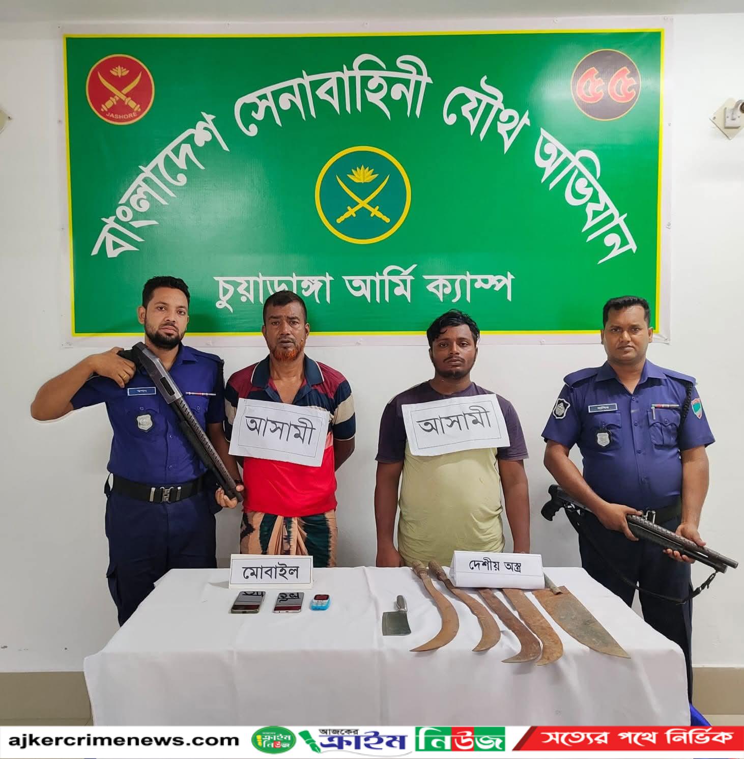মঙ্গলবার ভোরে চুয়াডাঙ্গা আর্মি ক্যাম্পের ক্যাপ্টেন মনজুরুল ইসলাম মাশফির নেতৃতের একটি দল চুয়াডাঙ্গা পৌর এলাকার কলোনী পাড়ায় অভিযান চালায়। এসময় তারা চুয়াডাঙ্গা কলোনীপাড়ার বাবর আলীর ছেলে মঞ্জুর হোসেন (৫২) ও মোঃ সেলিম উদ্দিনের ছেলে রাতুল (২২)কে আটক করে।পরে তাদের কাছে থাকা ৫টি রামদা, একটি চাপাতি, দুটি অ্যান্ড্রয়েড এবং দুটি বাটন ফোন জব্দ করা হয়।সেনাবাহিনীর টিম আটককৃতদের জিজ্ঞাসাবাদ শেষে দেশীয় অস্ত্র, চাঁদাবাজির প্রয়োজনীয় তথ্যসহ সকালে চুয়াডাঙ্গা সদর থানার পুলিশের কাছে হস্তান্তর করে।চুয়াডাঙ্গা সদর থানার পুলিশের পরিদর্শক (ওসি) খালেদুর রহমান সাংবাদিকদের বলেন, সকালে দুজনকে আটক করে সেনাবাহিনীর সদস্যরা থানায় হস্তান্তর করেছে। তাদের বিরুদ্ধে আইনগত ব্যবস্থা গ্রহন করা হয়েছে।