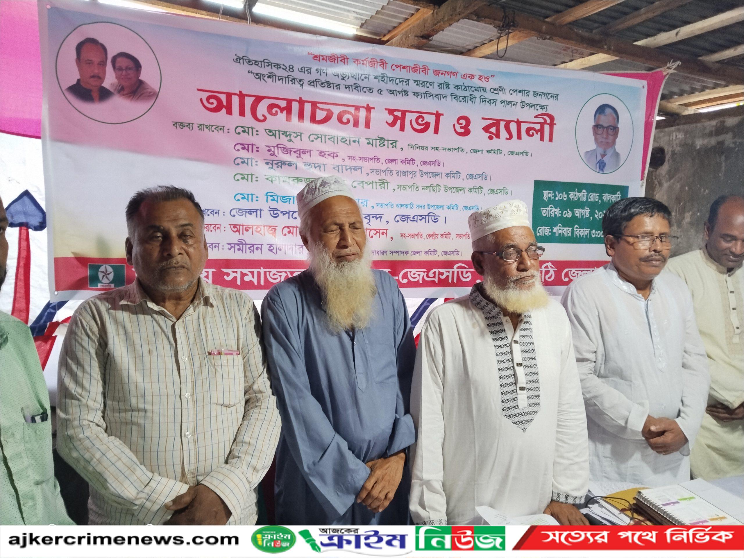 ঝালকাঠি প্রতিনিধি: ঝালকাঠিতে জাতীয় সমাজতান্ত্রিক দল জেএসডির শহরের কাটপট্টি এলাকায় অস্থায়ী কার্যালয়ে শনিবার ৯ আগষ্ট বিকেলে ঐতিহাসিক ২৪ এর জুলাই অভ্যুত্থানে শহীদদের স্মরনে, রাষ্ট্র কাঠামোর শ্রেণী পেশার জনগনের অংশীদারিত্ব প্রতিষ্ঠার দাবীতে এবং ৫ আগষ্ট ফ্যাসিবাদ বিরোধী দিবস পালনের উপলক্ষে, কেন্দ্রীয় কমিটির সহ-সভাপতি ও জেলা কমিটির সভাপতি আলহাজ্ব মোঃ সোহারাব হোসেনের সভাপত্বিতে এক আলোচনা সভা ও র্যালি অনুষ্টিত হয়। সভা সঞ্চালনা করেন কেন্দ্রীয় কমিটির সদস্য ও জেলা কমিটির সাধারণ সম্পাদক সমীরন হালদার। সভায় বক্তব্য রাখেন জেলা কমিটির সিনিয়ার সহ-সভাপতি আলহাজ্ব আব্দুস সোবাহান মাষ্টার, জেলা কমিটির সহ-সভাপতি মোঃ মুজিবুল হক, জেলা কমিটির মুক্তিযোদ্ধা বিষয়ক সম্পাদক কার্তিক চন্দ্র হালদার, সদর উপজেলার সভাপতি মোঃ মিজান তালুকদার, নলছিটি উপজেলার সভাপতি মোঃ কামরুজ্জামান বেপারী, রাজাপুর উপজেলার সভাপতি নরুল হুদা বাদলসহ দলীয় নেত্রীবৃন্দ। সভার শুরতে জুলাই শহীদদের স্মরনে ১মিনিট নীরবতা পালন ও দোয়া মোনাজাত করা হয়।