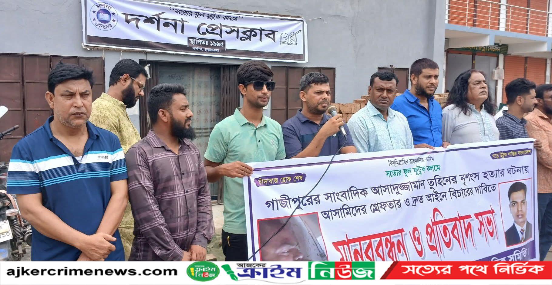 মাহমুদ হাসান রনি, চুয়াডাঙ্গা প্রতিনিধিঃ চুয়াডাঙ্গার দর্শনা প্রেসক্লাবে সাংবাদিকদের উদ্যোগে গাজীপুরের সাংবাদিক আসাদুজ্জামান তুহিনকে হত্যা এবং সাংবাদিক আনোয়ার হোসেনকে পিটিয়ে আহত করার প্রতিবাদে সুষ্ঠ বিচারের দাবীতে মানববন্ধন ও বিক্ষোভ সমাবেশ অনুষ্ঠিত হয়েছে।