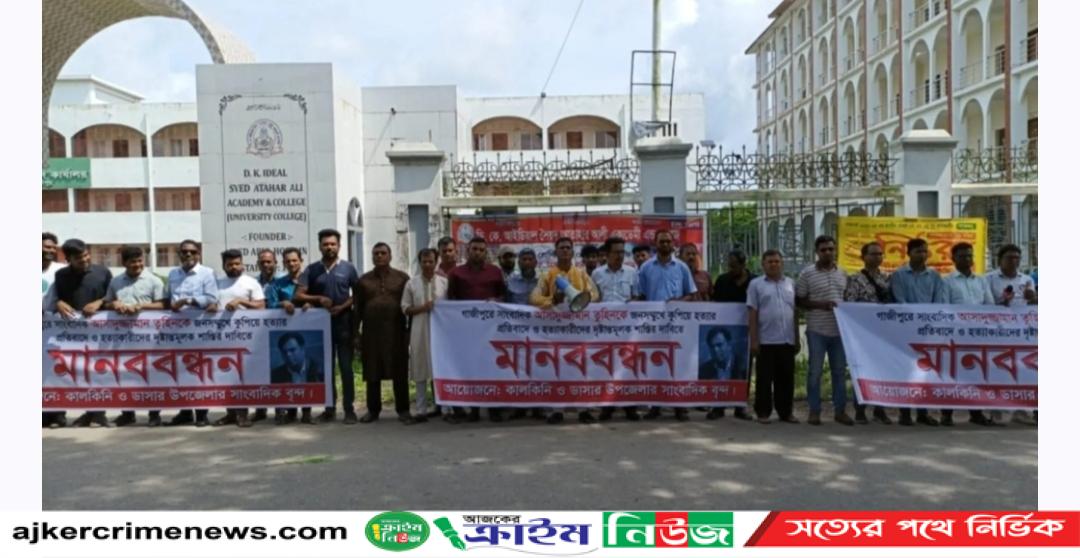 গাজীপুরের কলম সৈনিক সাংবাদিক মো. আসাদুজ্জামান তুহিন হত্যার প্রতিবাদে এবং হত্যাকারীদের ফাঁসির দাবিতে মাদারীপুর জেলার ডাসারে মানববন্ধন ও বিক্ষোভ কর্মসূচি অনুষ্ঠিত হয়েছে। আজ রবিবার সকালে ডাসার ও কালকিনি উপজেলার বিভিন্ন প্রিন্ট ও ইলেকট্রনিক মিডিয়ায় কর্মরত সাংবাদিকরা ডাসার উপজেলা পরিষদের সামনে ঘন্টাব্যাপী এ কর্মসূচি পালন করেন।