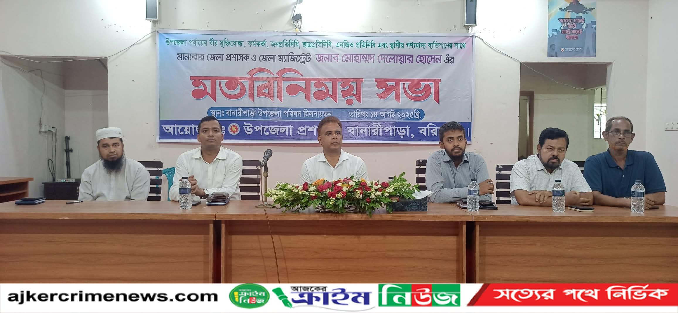 বানারীপাড়ায় বীর মুক্তিযোদ্ধা, বিভিন্ন দপ্তরের সরকারি কর্মকর্তা, জনপ্রতিনিধি,, এনজিও প্রতিনিধি এবং স্থানীয় গন্যমান্য ব্যাক্তিবর্গের সঙ্গে বরিশাল জেলা প্রশাসক ও জেলা ম্যাজিস্ট্রেট মোহাম্মদ দেলোয়ার হোসেনের মতবিনিময় সভা অনুষ্ঠিত হয়েছে। বৃহস্পতিবার (১৪ আগস্ট) সকালে উপজেলা পরিষদ মিলনায়তনে উপজেলা নির্বাহী কর্মকর্তা মোঃ বায়েজিদুর রহমানের সভাপতিত্বে অনুষ্ঠিত এ মতবিনিময় সভায় প্রধান অতিথি ছিলেন বরিশাল জেলা প্রশাসক মোহাম্মদ দেলোয়ার হোসেন। এসময় অন্যান্যের মধ্যে বক্তৃতা করেন উপজেলা কৃষি অফিসার মাহফুজুর রহমান,উপজেলা বিএনপির সহ-সভাপতি গোলাম মাহমুদ মাহাবুব মাষ্টার, বীর মুক্তিযোদ্ধা খলিলুর রহমান চোবদার, পৌর বিএনপির জ্যেষ্ঠ সহ-সভাপতি আব্দুস সালাম,উপজেলা জামায়াতের সেক্রেটারী মাওলানা মোকাম্মেল হোসেন মোজাম্মেল প্রমুখ। এর আগে জেলা প্রশাসক মোহাম্মদ দেলোয়ার হোসেন বানারীপাড়া থানা পরিদর্শন করেন। এসময় থানার অফিসার ইনচার্জ (ওসি) মোঃ মোস্তফা তাকে ফুলেল শুভেচ্ছায় সিক্ত করেন। পরে তিনি উপজেলার সলিয়াবাকপুরে দুটি উন্নয়ন প্রকল্পের উদ্বোধন করেন।