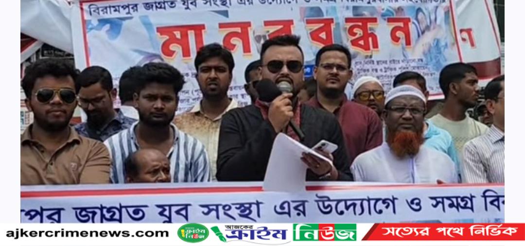 উক্ত মানববন্ধনে বক্তব্য রাখেন বিরামপুর জাগ্রত যুব সংস্থার সভাপতি মিশুক আহম্মেদ, বিরামপুর প্রেসক্লাব (কলাবাগান)-এর আহ্বায়ক সাংবাদিক শাহ্ আলম মন্ডল, বিরামপুর প্রেসক্লাব (কলেজ বাজার)-এর সভাপতি সাংবাদিক মোরশেদ মানিক, বিরামপুর সরকারি কলেজের উপাধ্যক্ষ অদ্বৈত কুমার অপু, বিরামপুর পাইলট উচ্চ বিদ্যালয়ের প্রধান শিক্ষক আরমান হোসেন, সাবেক পৌর কাউন্সিলর শওকত আলী, বিজুল দারুল হুদা কামিল মাদ্রাসার হেড মুহাদ্দিস ডক্টর এনামুল হক, ঢাকা মোড় টোয়েন্টিফোর ডটকমের প্রকাশক ও সম্পাদক রফিকুল ইসলাম সরকার, সাংবাদিক ইব্রাহিম মিয়া এবং বিরামপুর যুব ক্লাবের সভাপতি আহসান হাবিব জনি।