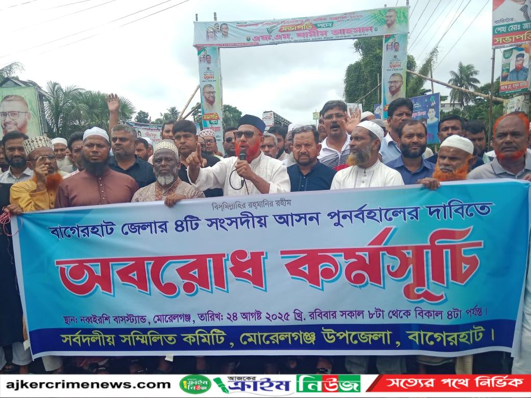 এস. এম সাইফুল ইসলাম কবির, বাগেরহাট : বাগেরহাট-৪ সংসদীয় আসন বাতিলের সিদ্ধান্তের প্রতিবাদে এবং আসনটি পূর্ণ পুনর্বহালের দাবিতে মোরেলগঞ্জে সর্বদলীয় সম্মিলিত কমিটির ডাকে আজ রবিবার(২৪ আগস্ট) সকাল ৮টা থেকে বিকেল ৪টা পর্যন্ত সড়ক অবরোধ কর্মসূচি পালিত হয়েছে।অবরোধ কর্মসূচিতে অংশ নেন এলাকার বিভিন্ন রাজনৈতিক দলের নেতাকর্মীরা। তারা অভিযোগ করেন, বাগেরহাট-৪ আসন বাতিলের সিদ্ধান্ত জনবিচ্ছিন্ন ও অগণতান্ত্রিক। আসনটি বহাল না রাখা হলে বৃহত্তর আন্দোলনের মাধ্যমে তা প্রতিহত করা হবে বলেও হুঁশিয়ারি দেন তারা। আন্দোলনে নেতৃত্ব দেন বাগেরহাট-৪ আসনের গণমানুষের নেতা অধ্যক্ষ আব্দুল আলিম। এছাড়াও উপস্থিত ছিলেন উপজেলা বিএনপির সভাপতি শহিদুল হক বাবুল, উপজেলা জামায়াতের আমির মাওলানা শাহাদাত হোসেন, নায়েবে আমির মাস্টার মনিরুজ্জামান, পৌর বিএনপির সভাপতি শিকদার ফরিদুল ইসলাম, সাধারণ সম্পাদক আসাদুজ্জামান মিলন, জামায়াতের পৌর আমির মাস্টার রফিকুল ইসলাম, সাধারণ সম্পাদক মাওলানা আল আমিন হোসাইন, সাবেক পৌর বিএনপির সদস্য সচিব অধ্যক্ষ জাহাঙ্গীর আল আজাদ, উপজেলা ছাত্রদলের সাবেক আহ্বায়ক আবু সালেহ এবং বারইখালী জামায়াতের আমির মুহিবুল্লাহ রফিক প্রমুখ। সমাবেশে বক্তারা বলেন, “বাগেরহাট-৪ আসন আমাদের অস্তিত্বের প্রতীক। এটিকে মুছে ফেলা মানে আমাদের কণ্ঠরোধ করা। আমরা তা মেনে নেব না।