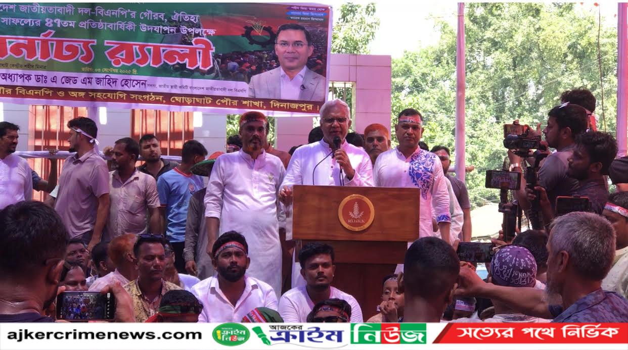 বুধবার (৩ সেপ্টেম্বর) দুপুর সাড়ে ১২টায় পৌর কেন্দ্রীয় শহীদ মিনারে পৌর বিএনপি ও অঙ্গ সহযোগী সংগঠনের আয়োজনে ঘোড়াঘাট পৌর বিএনপির সভাপতি আব্দুস সাত্তার মিলনের সভাপতিত্বে ও ভারপ্রাপ্ত সাধারণ সম্পাদক মুক্তার হোসেনের সঞ্চালনায় অনুষ্ঠিত বাংলাদেশ জাতীয়তাবাদী দল-বিএনপির ৪৭তম প্রতিষ্ঠাবার্ষিকী উপলক্ষে আলোচনা সভায় প্রধান অতিথির বক্তব্যে তিনি উপরোক্ত কথা বলেন।
